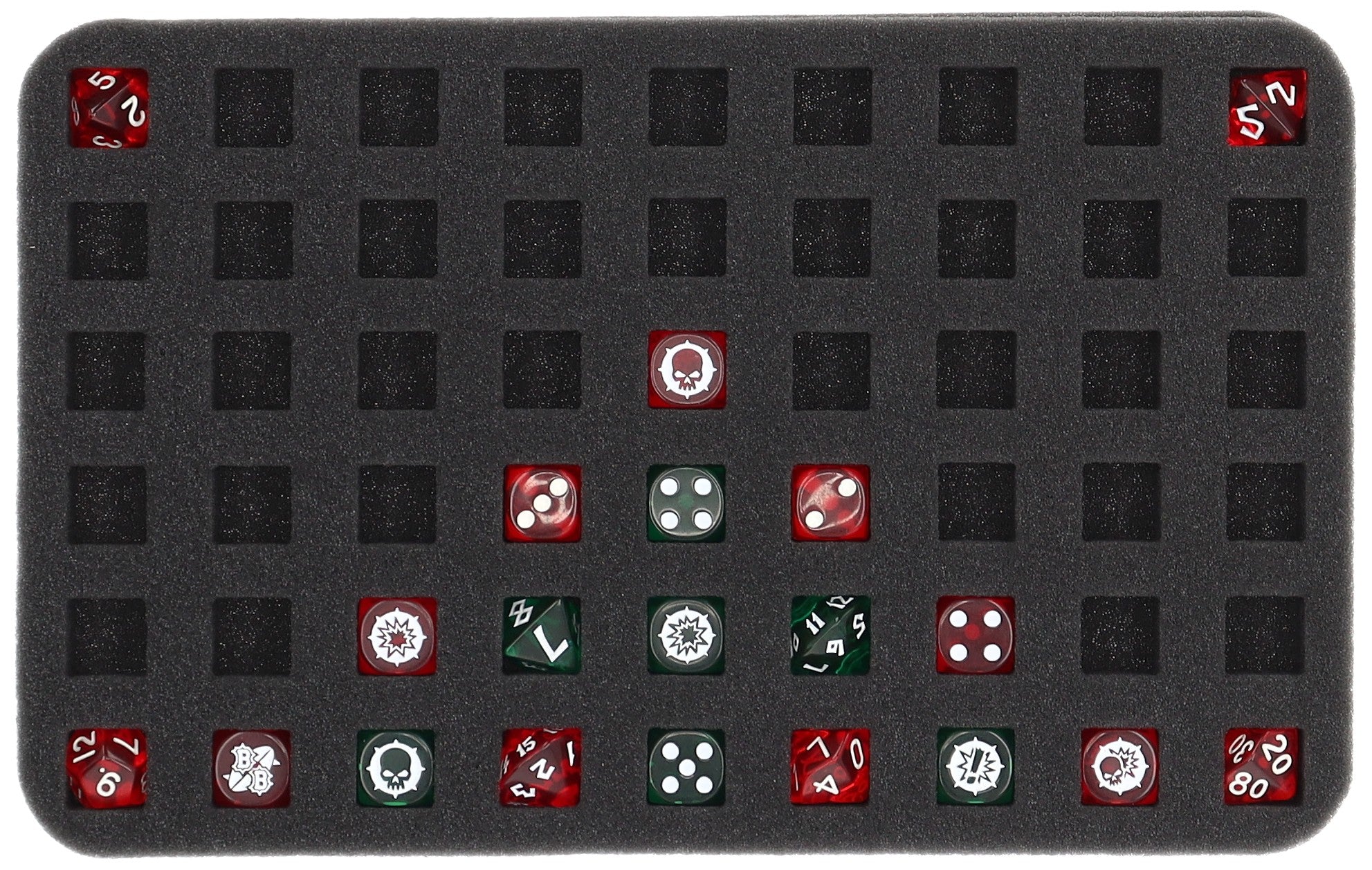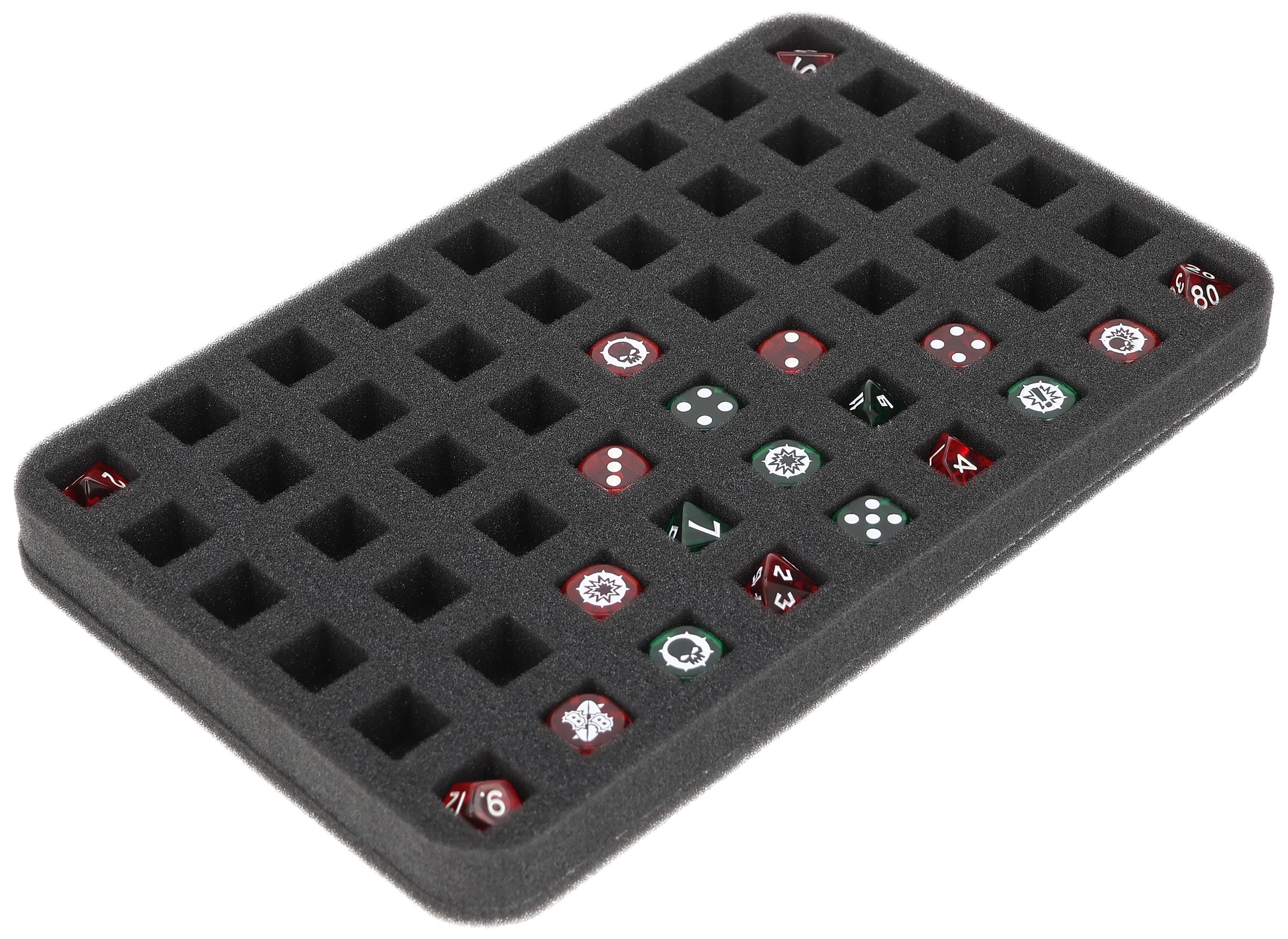 We have just the thing for you if you want to keep your Blood Bowl dice safe and tidy. Our high-quality Half-Size foam tray is perfect for this. It has 54 compartments specially designed for dice with an edge length of 16 mm.