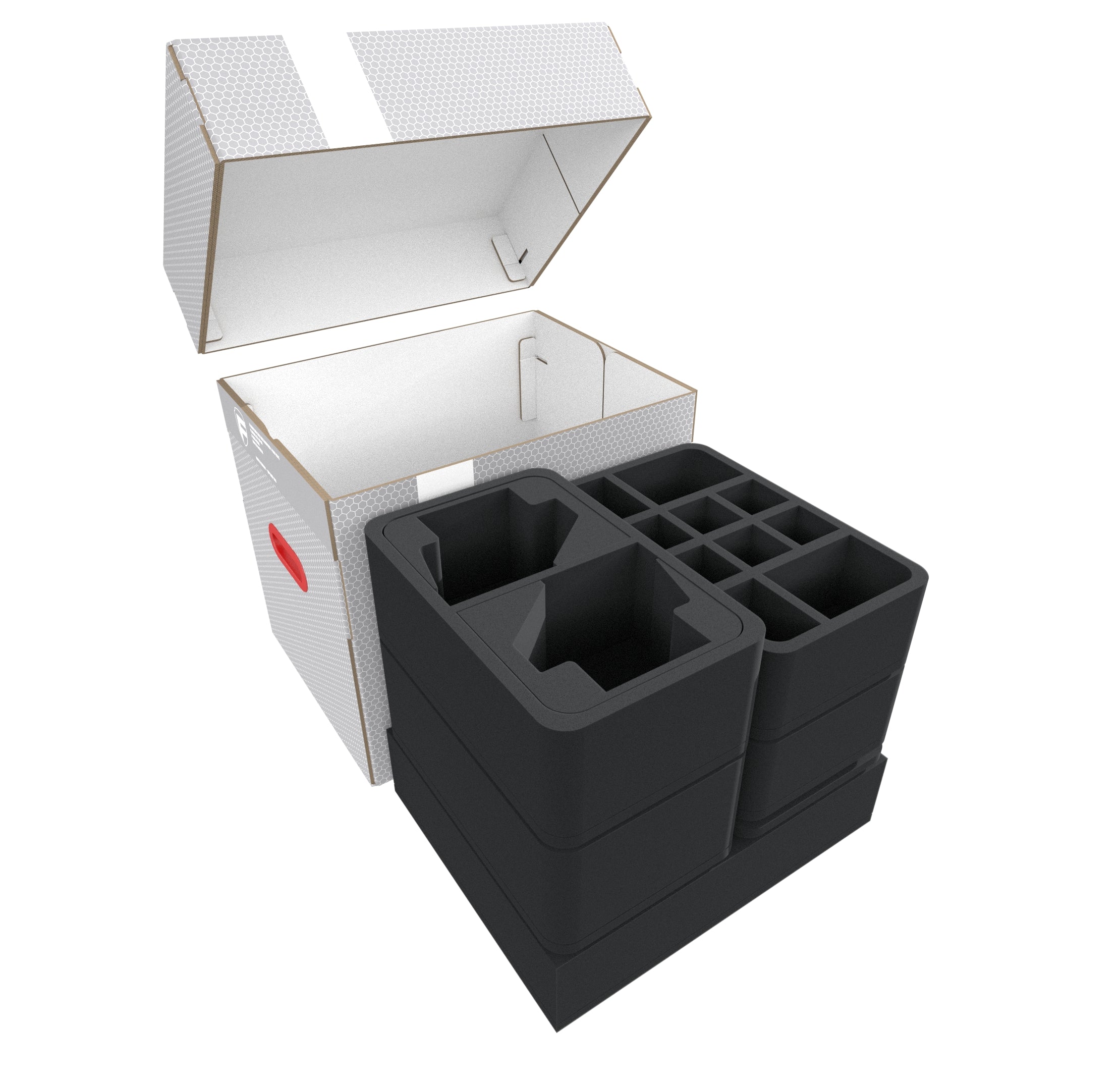 The Storage Box FSLB310 is made of coated, corrugated cardboard. This makes it not only pleasantly light but also very tear-resistant and stable. The attachable lid reliably protects the contents from dust and other external influences. The appropriate foam trays, miniatures, game material, and all other goods can be stored safely - and conveniently transported with the two plastic-reinforced carrying handles on the sides.