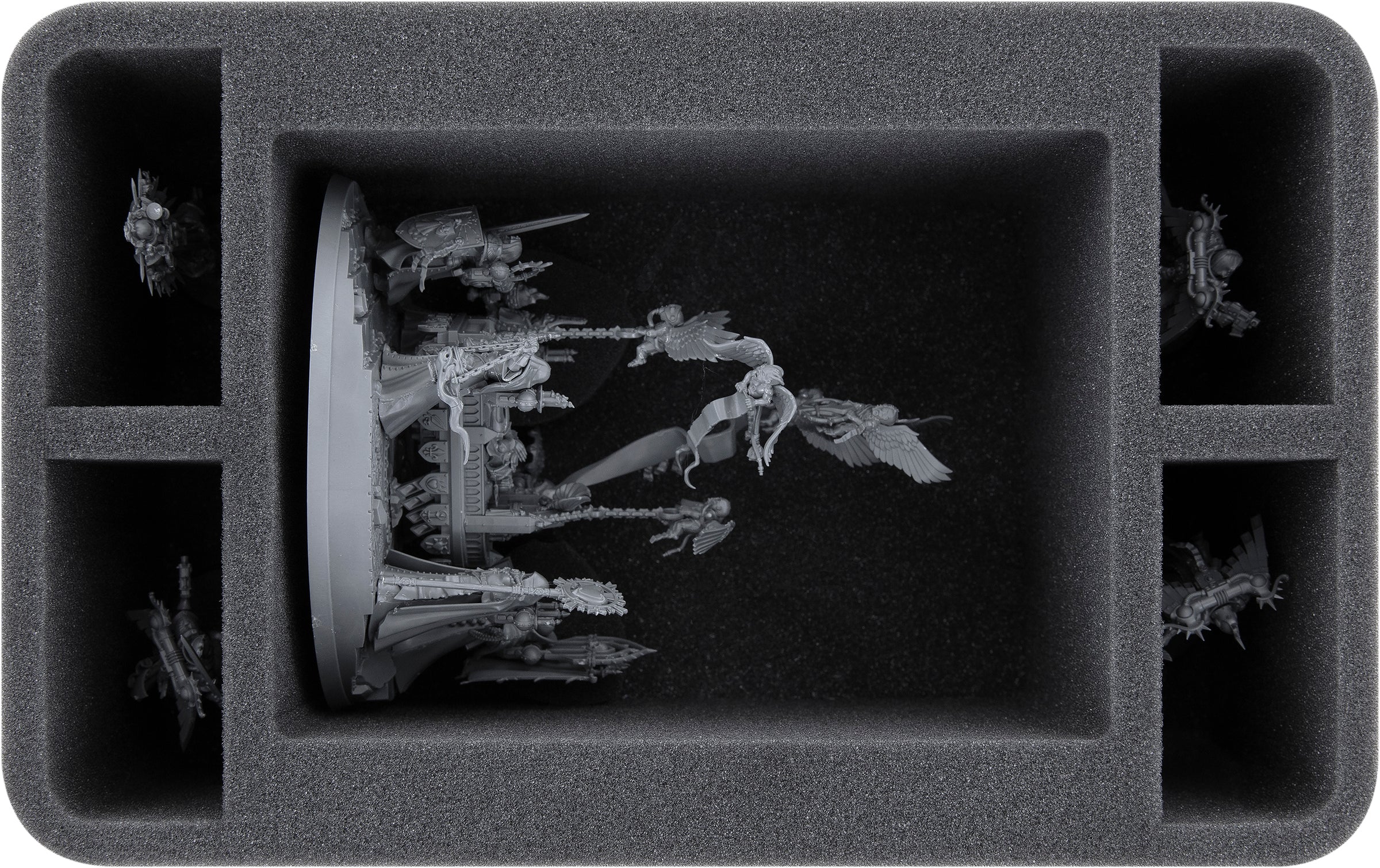 - 1 Full-Size foam tray with 6 compartments for larger miniatures like Celestine, the Living Saint, Zephyrim Squad and models with similar dimensions (FS060A010)