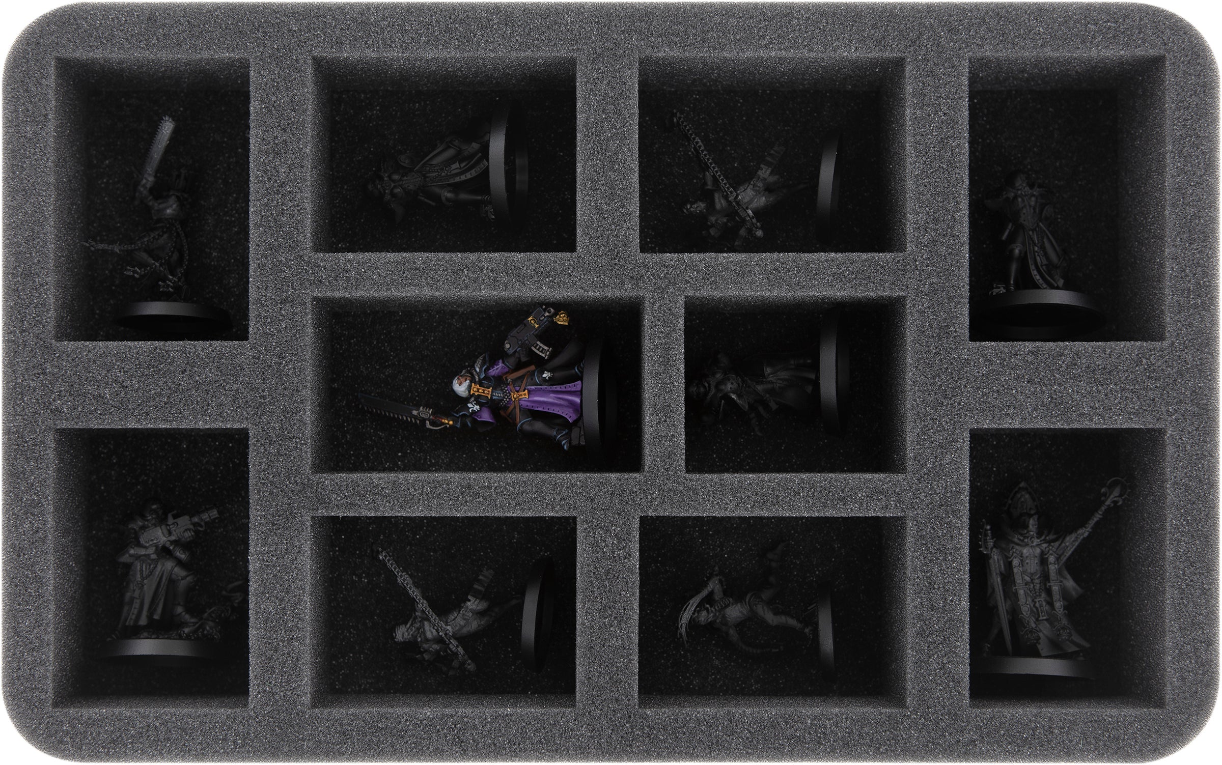 In the Half-Size foam tray with ten compartments, you can store and transport up to ten models. The compartments in two different sizes are perfect for standard Adepta Sororitas units. Or for units with a banner-bearer and towering details.