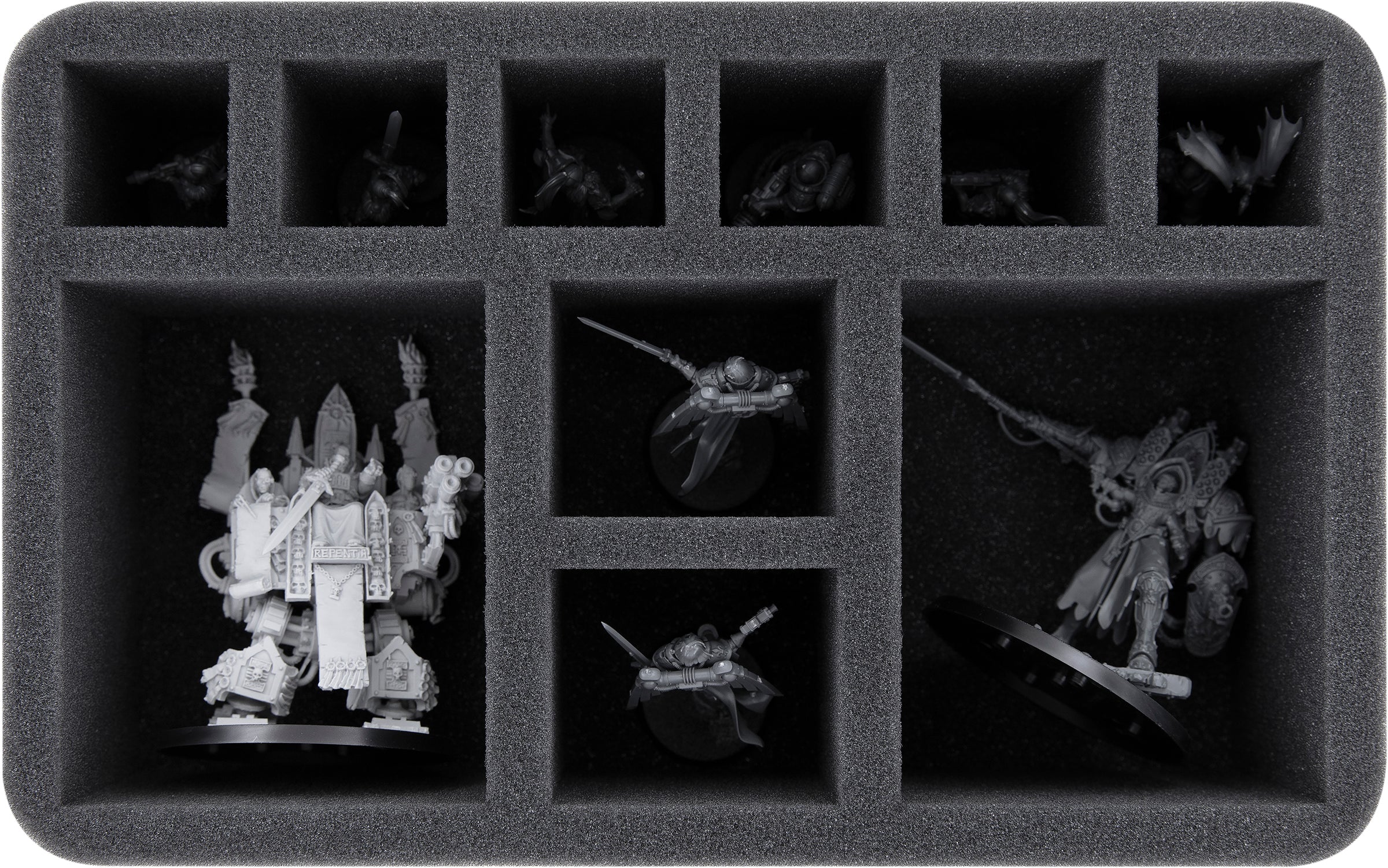 - 1 Half-Size foam tray with ten compartments for different-sized miniatures like Morvenn Vahl - Abbess Sanctorum, Battle Sisters, Battle Sister with Simulacrum Imperialis (HS080A010)