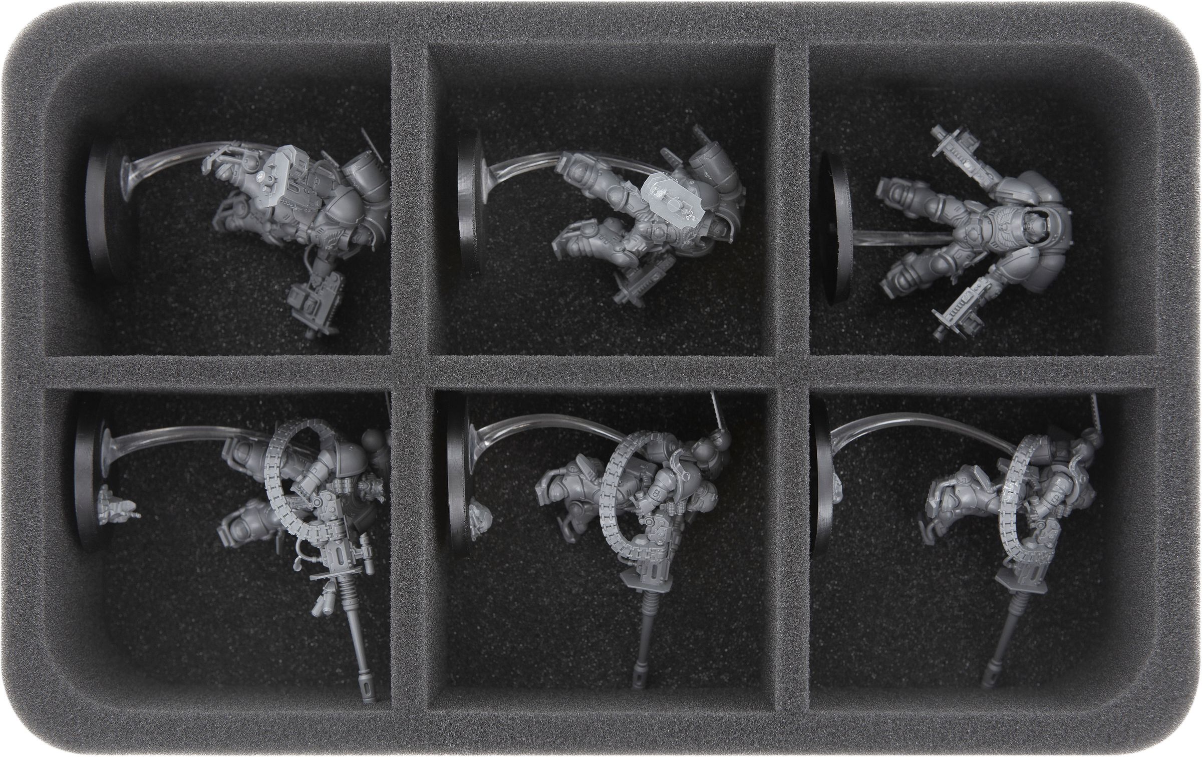 - 1 Half-Size foam tray with 6 compartments for large miniatures like Paragon Warsuits and models with similar dimensions (HS060A065)