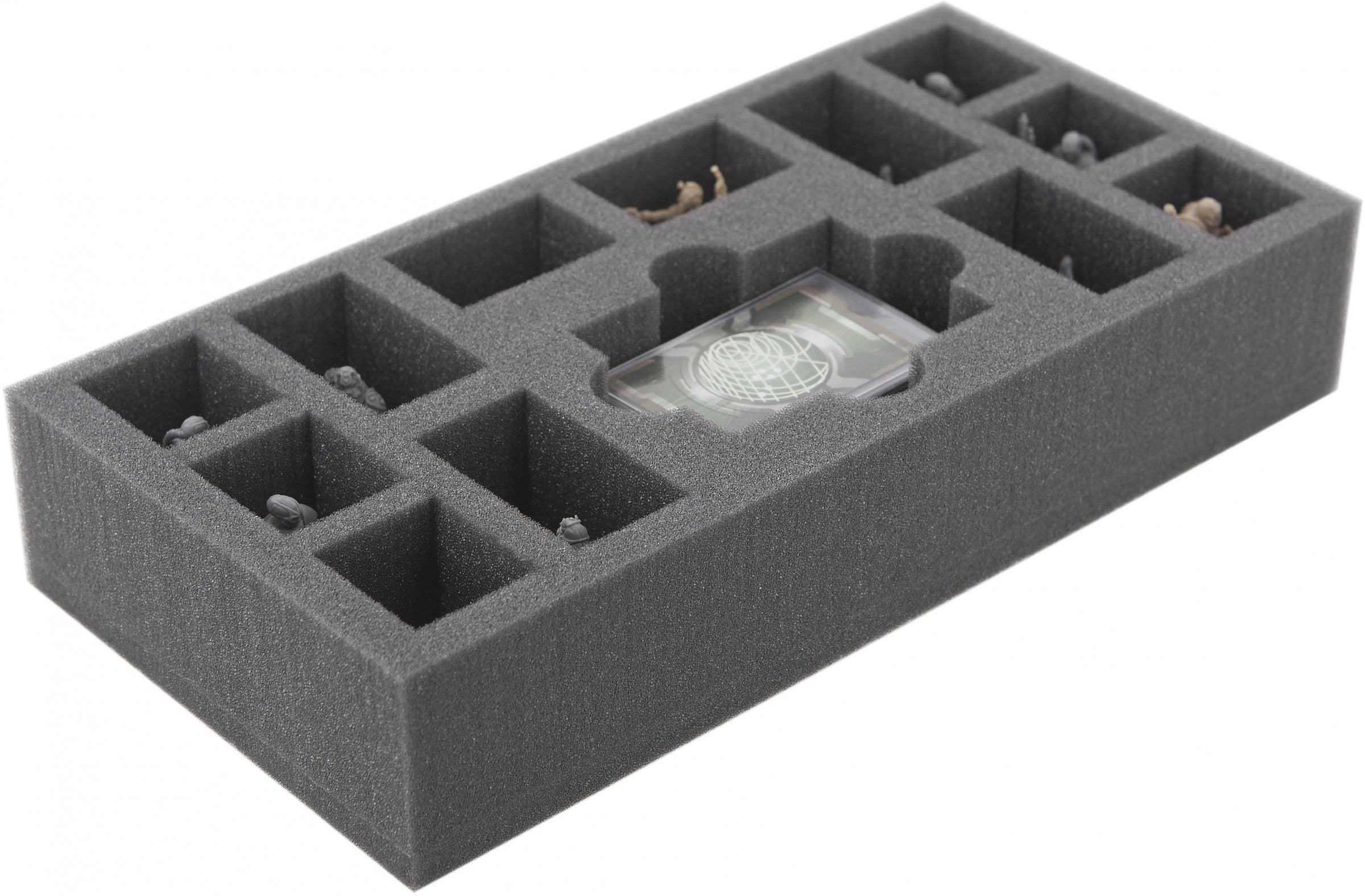 This foam tray suitable for retrofitting the game content from the Imperial Assault: Jabba's Realm board game box. The 13 different sized compartments are suitable for miniatures and cards in sleeves. The foam tray has the half size of the original board game box, two juxtaposed fit into the original board box and perfectly into the Feldherr storage box LBBG.