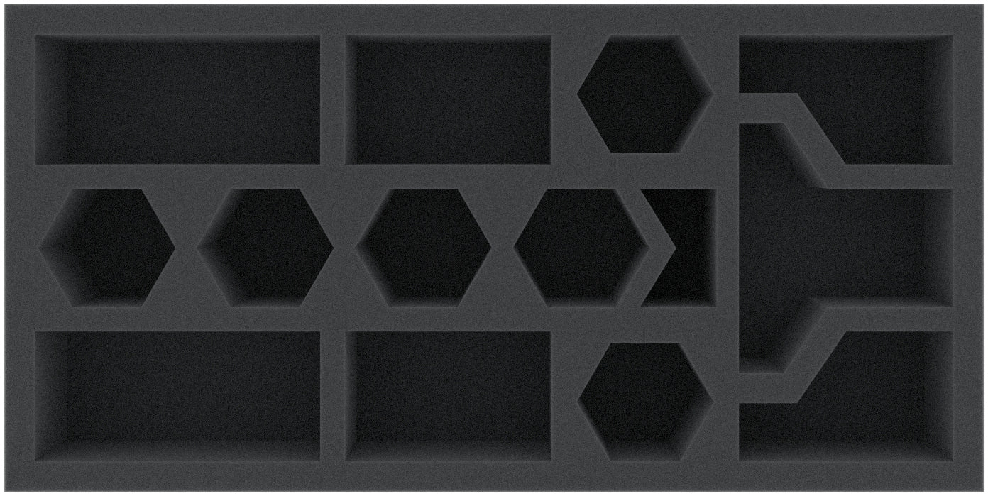 This 50 mm mm high foam tray is divided into 14 compartments. It is particularly suitable for the safe storage of tabletop and board game miniatures, as well as other fragile models and small parts.
