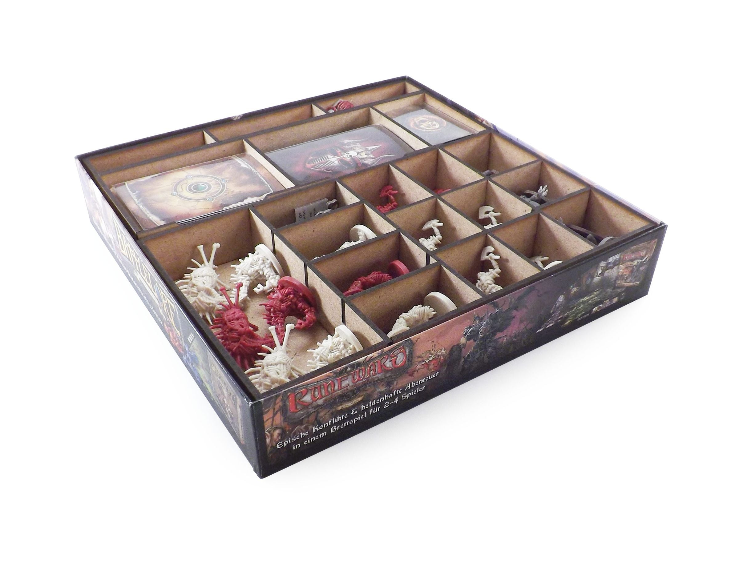 To bring the epic struggle between brave heroes and evil overlord to the table, the game comes with a wealth of map tiles, monsters, dice, doors, tokens and cards. Our insert sorts and groups all these components for an orderly descent into the next dungeon.