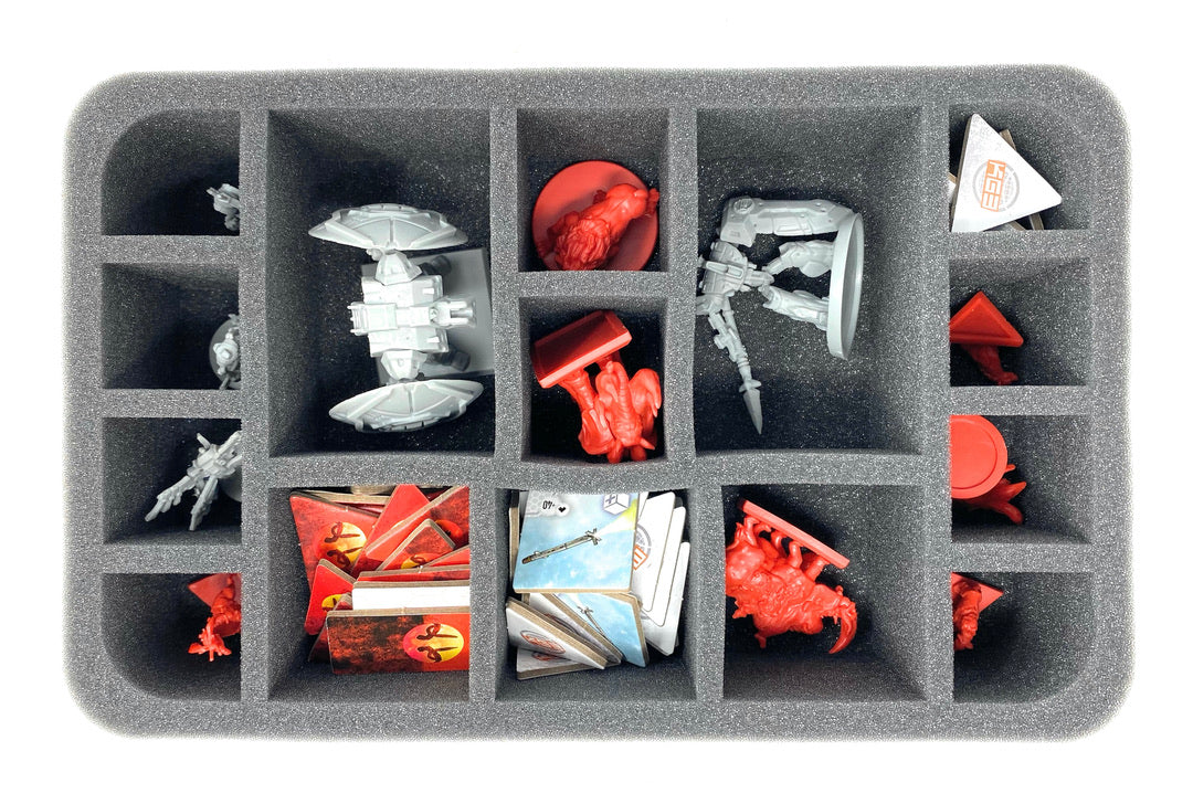 - 1 Half-Size foam tray with 15 compartments for miniatures like alternate Beowulf, alternate Drachentöter, Mascots, and Kickstarter Exclusives like Skybound (HSMEDO065BO)