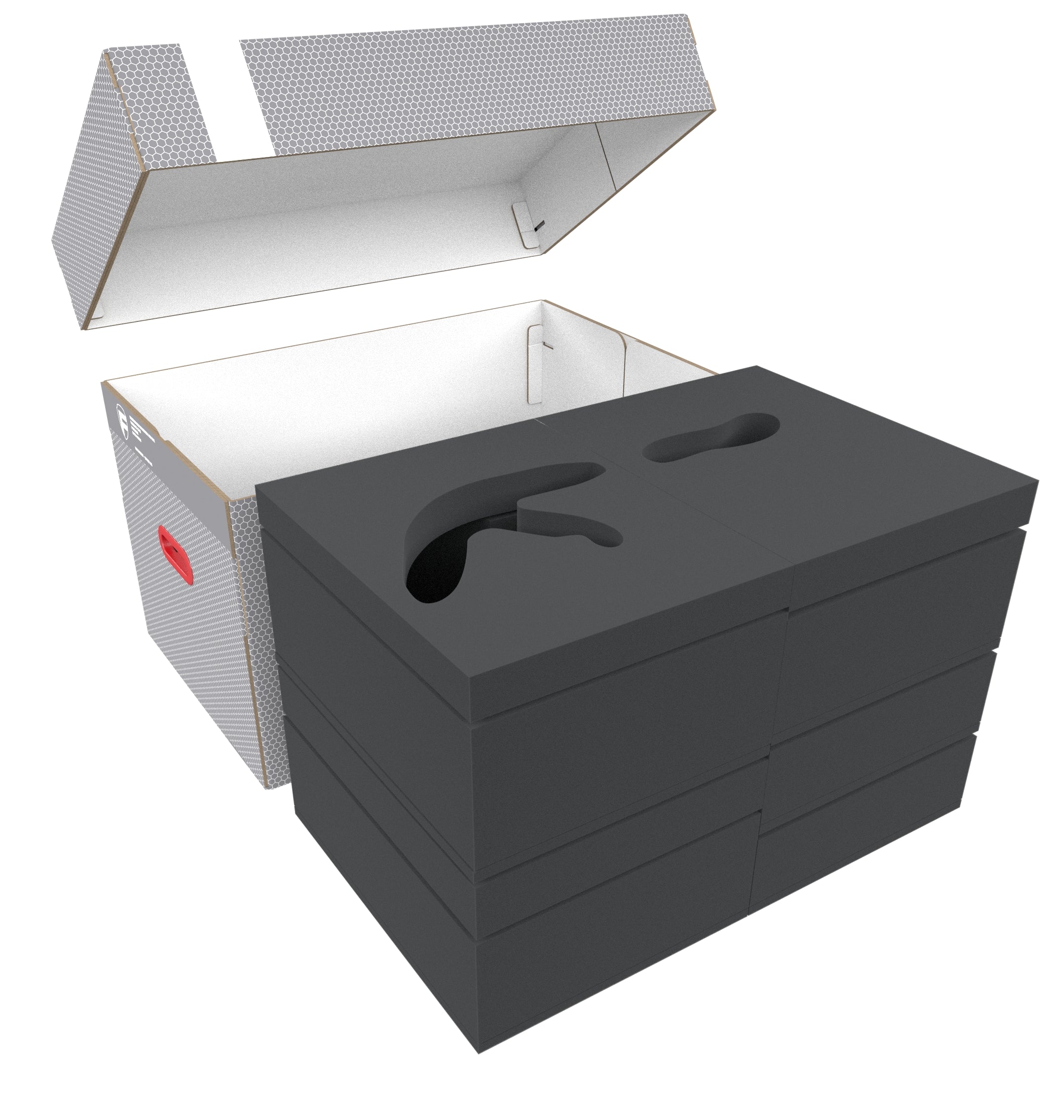 The storage box itself is made of coated, double-walled cardboard, It is therefore both very light and very stable. The attachable lid reliably protects your miniatures from dust and other external influences. With the two plastic-reinforced carrying handles on the sides, you can transport the box very easily.