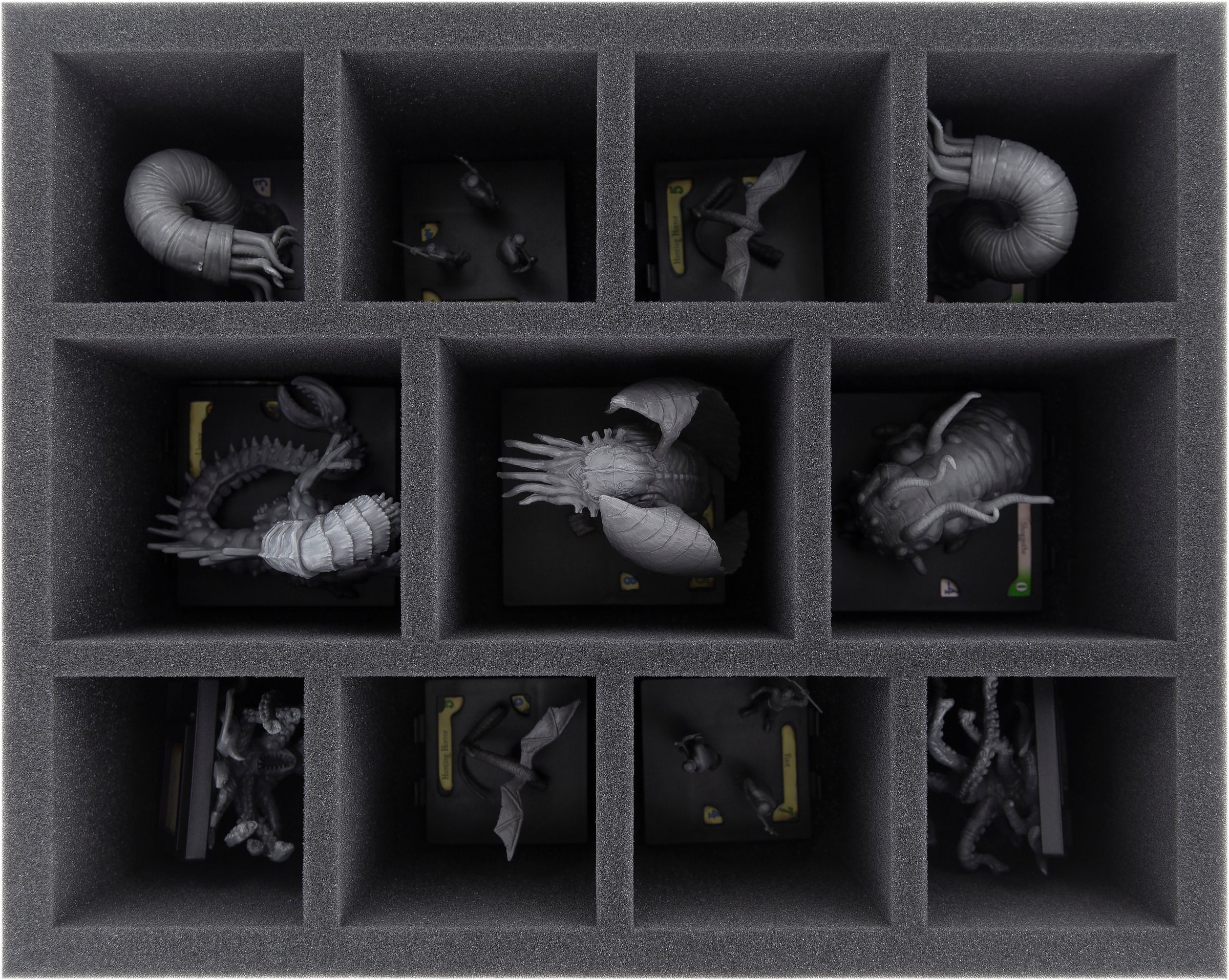 On the Feldherr Full-Size foam tray with 11 compartments, you have room for your large and medium-sized monster figures. Three compartments are designed for the miniatures on large base, like the Shoggoths. In the 8 smaller compartments you can safely store the figures on medium-sized base (e.g. Chtonians and Star Spawn).
