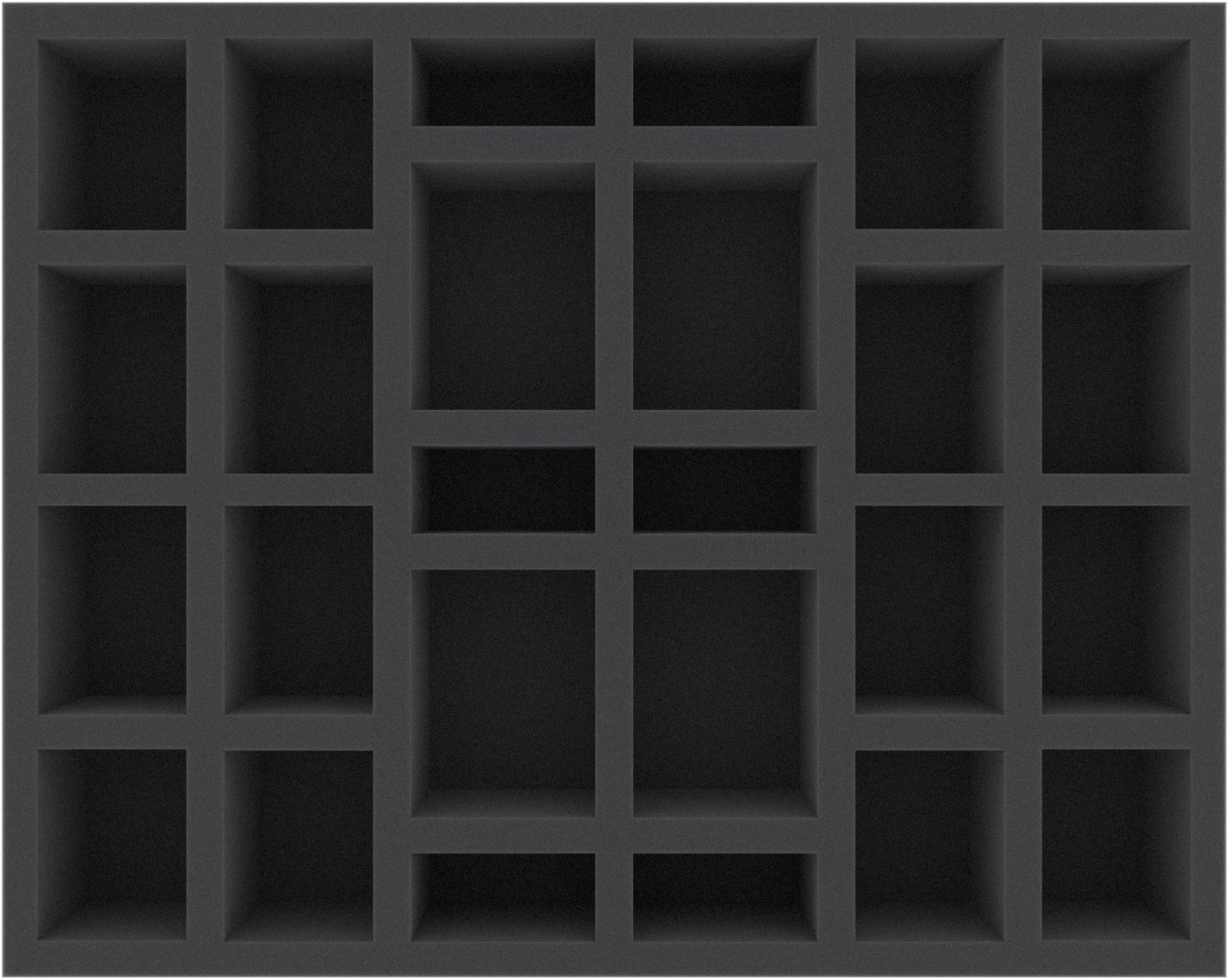 In the Feldherr insert with 26 compartments, you can accomodate your small monster figures and the investigators. The 20 larger compartments are designed for the monster miniatures on small base, like the Mi-Gos or the Hounds of Tindalos. In the 6 small compartments you can sort the investigator figures.