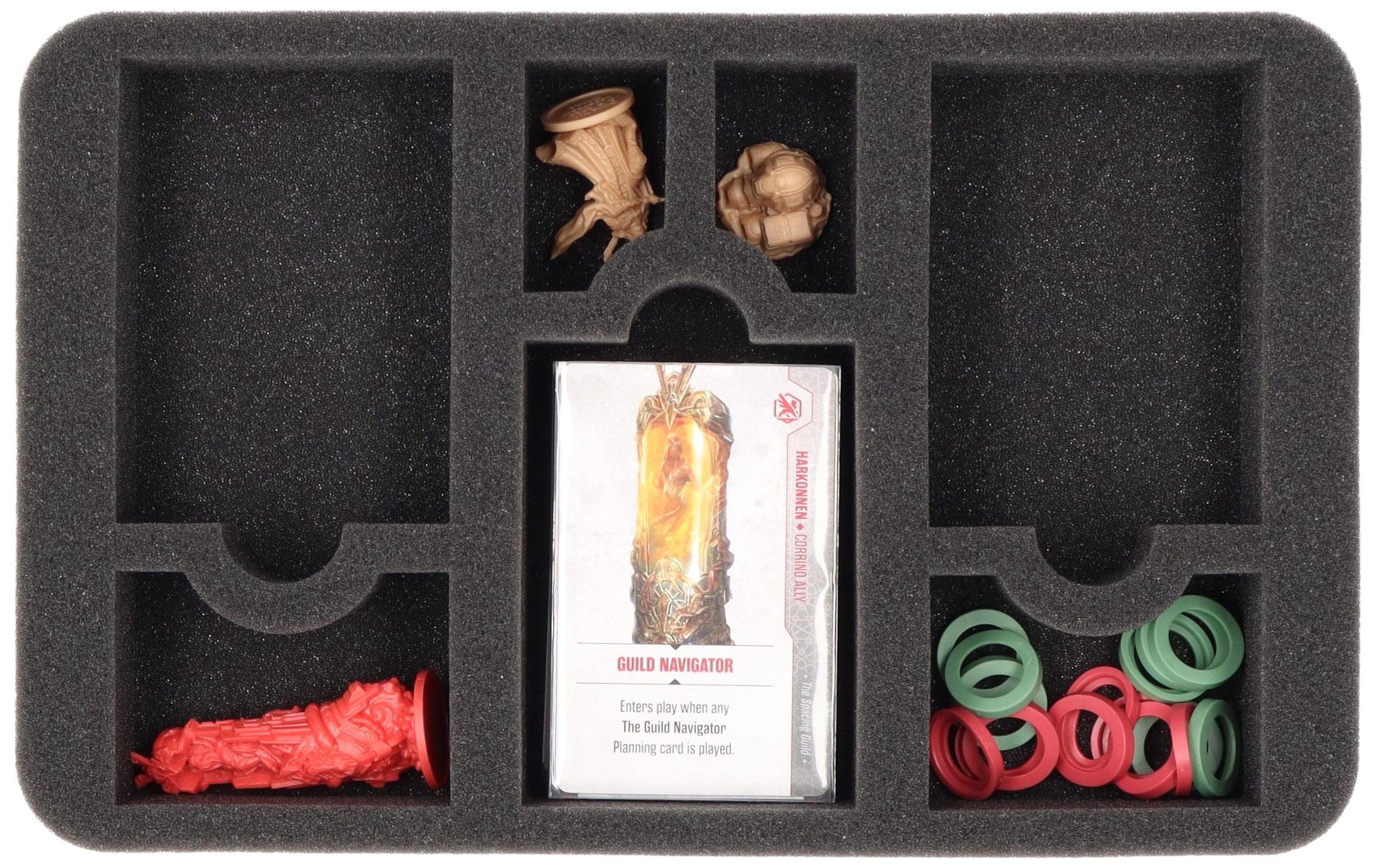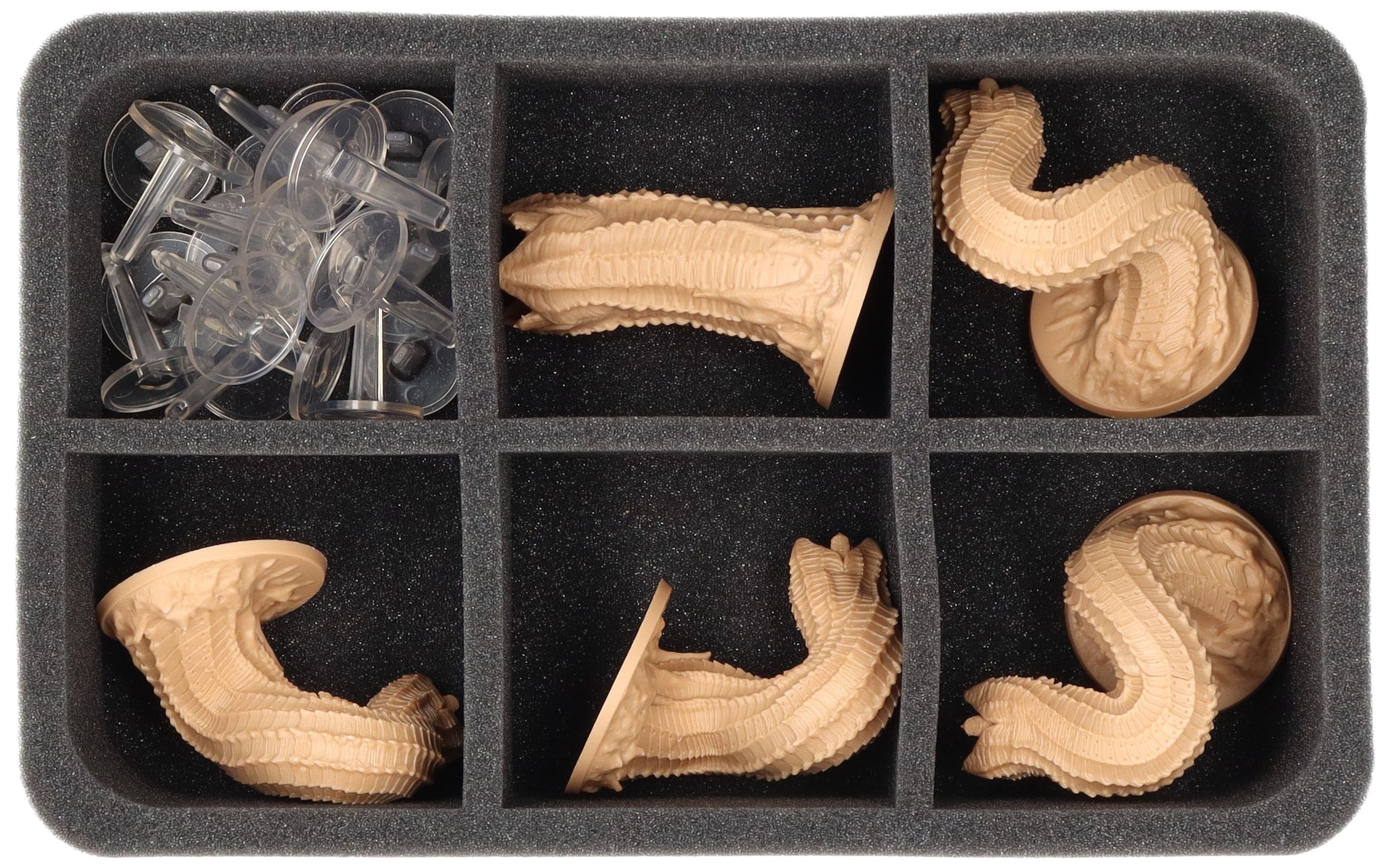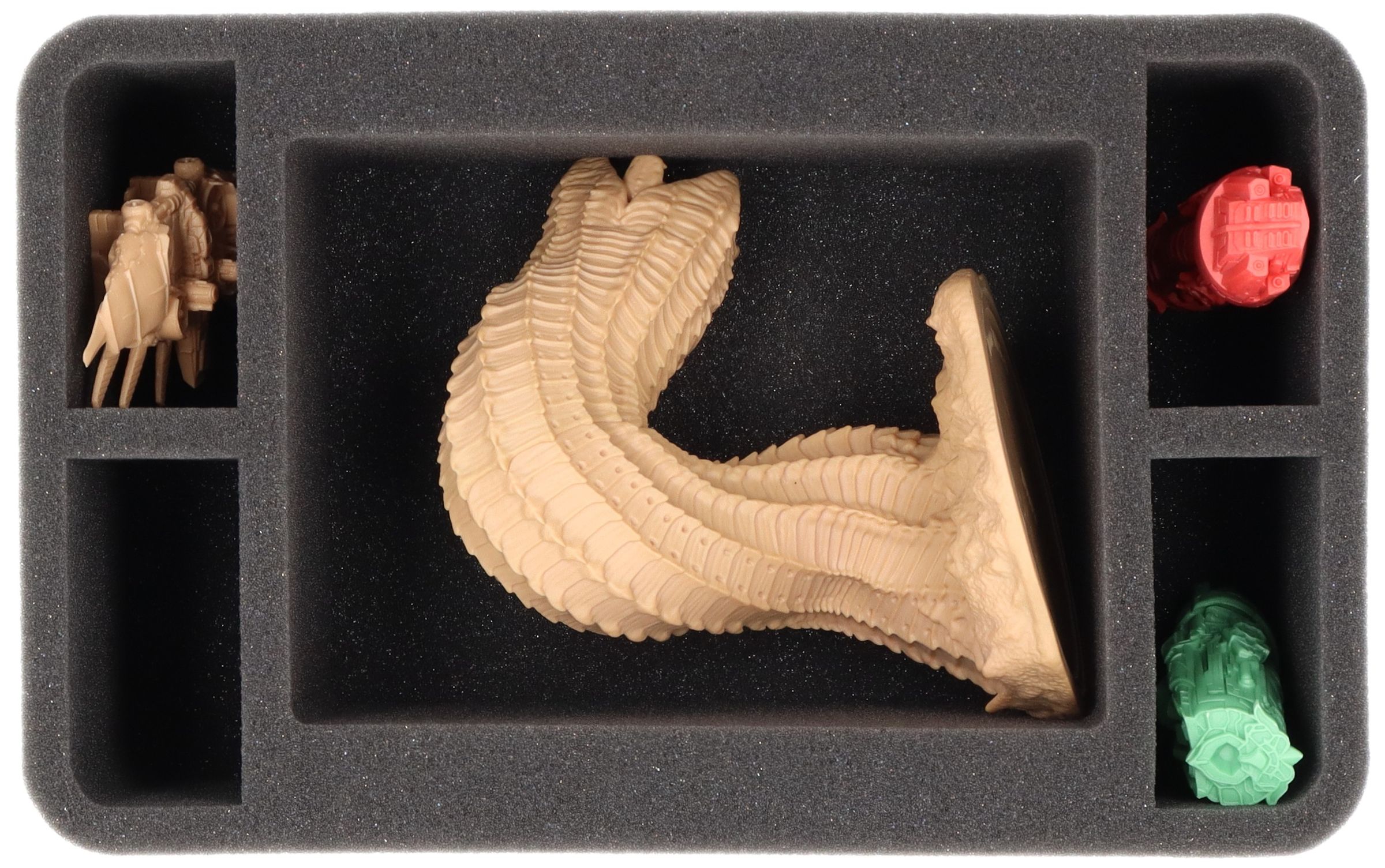• 1 Half-Size foam tray with 5 compartments for the large sandworm + miniatures from the expansions (HSMEVE105BO)