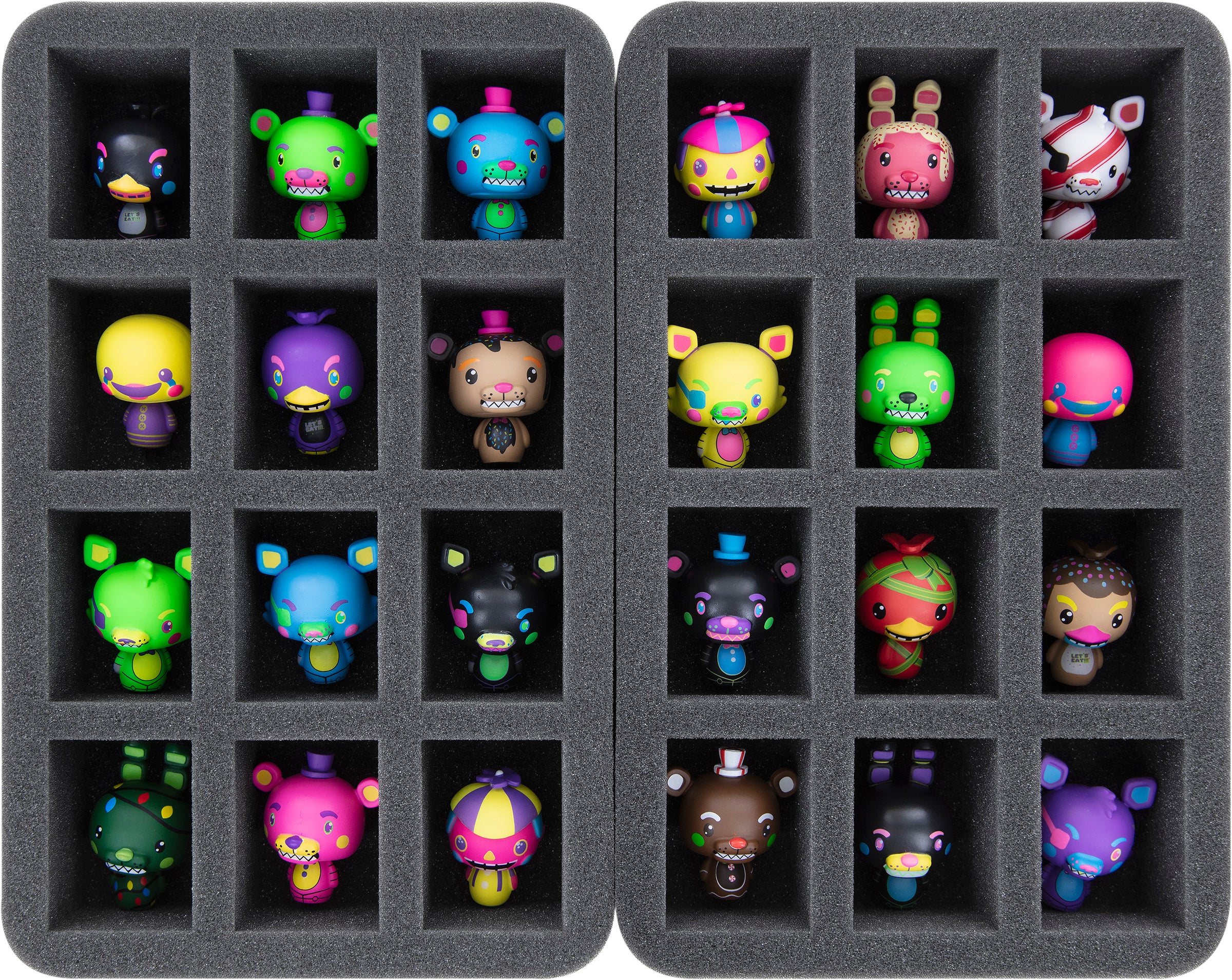 • 2 Half-Size foam trays, each with 12 compartments for FunkoPocket Pops or figures with similar dimensions (HS050I012BO)