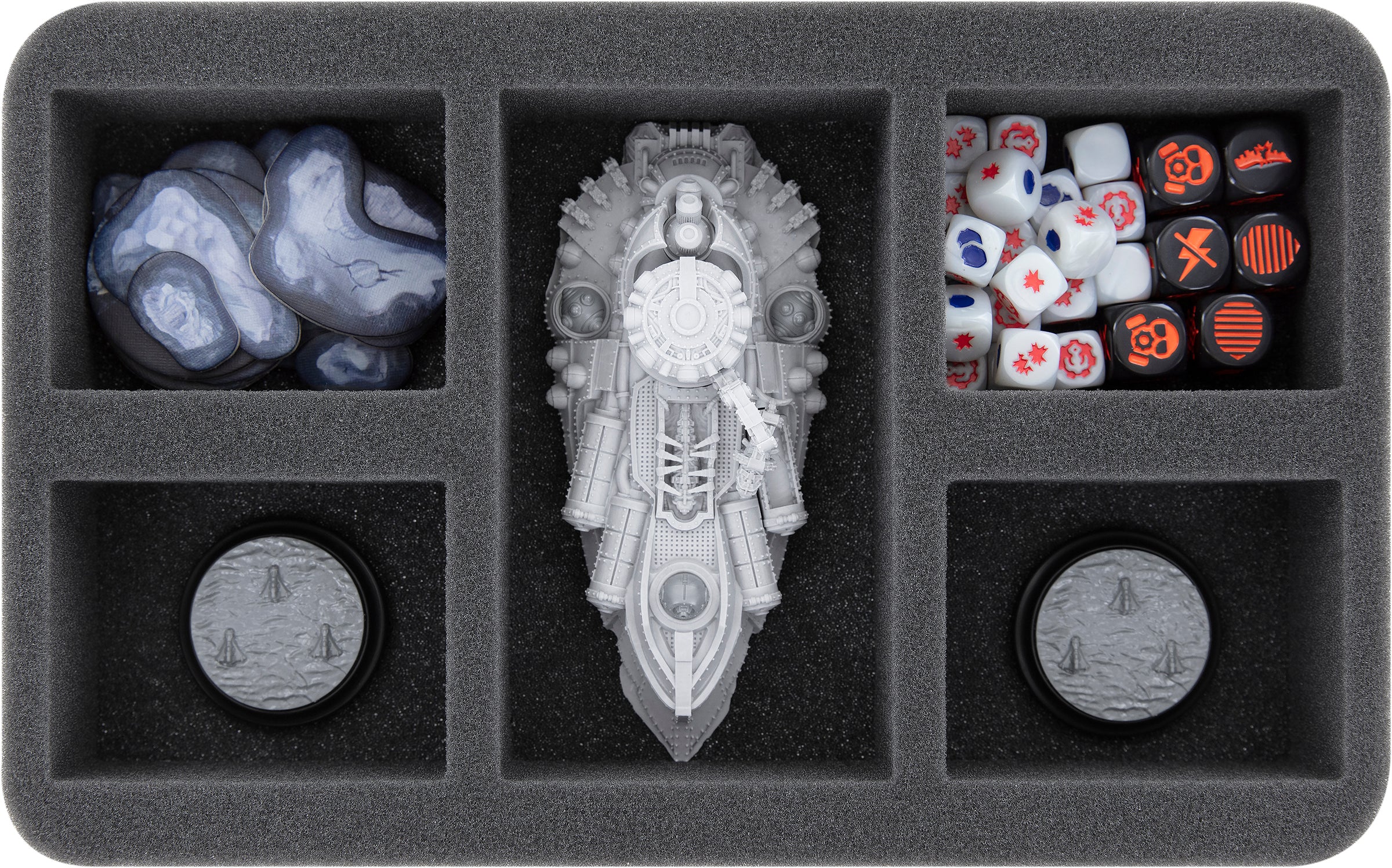 - 3 Half-Size foam trays with each 5 compartments for e.g. one Descartes Class Control Ship, Hypatia Class Generator Ship or Borodino Class Battleship and game material (HS050A089)