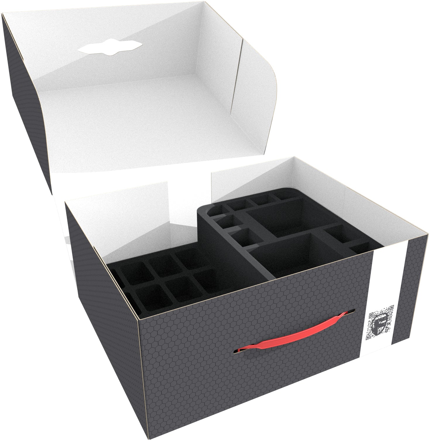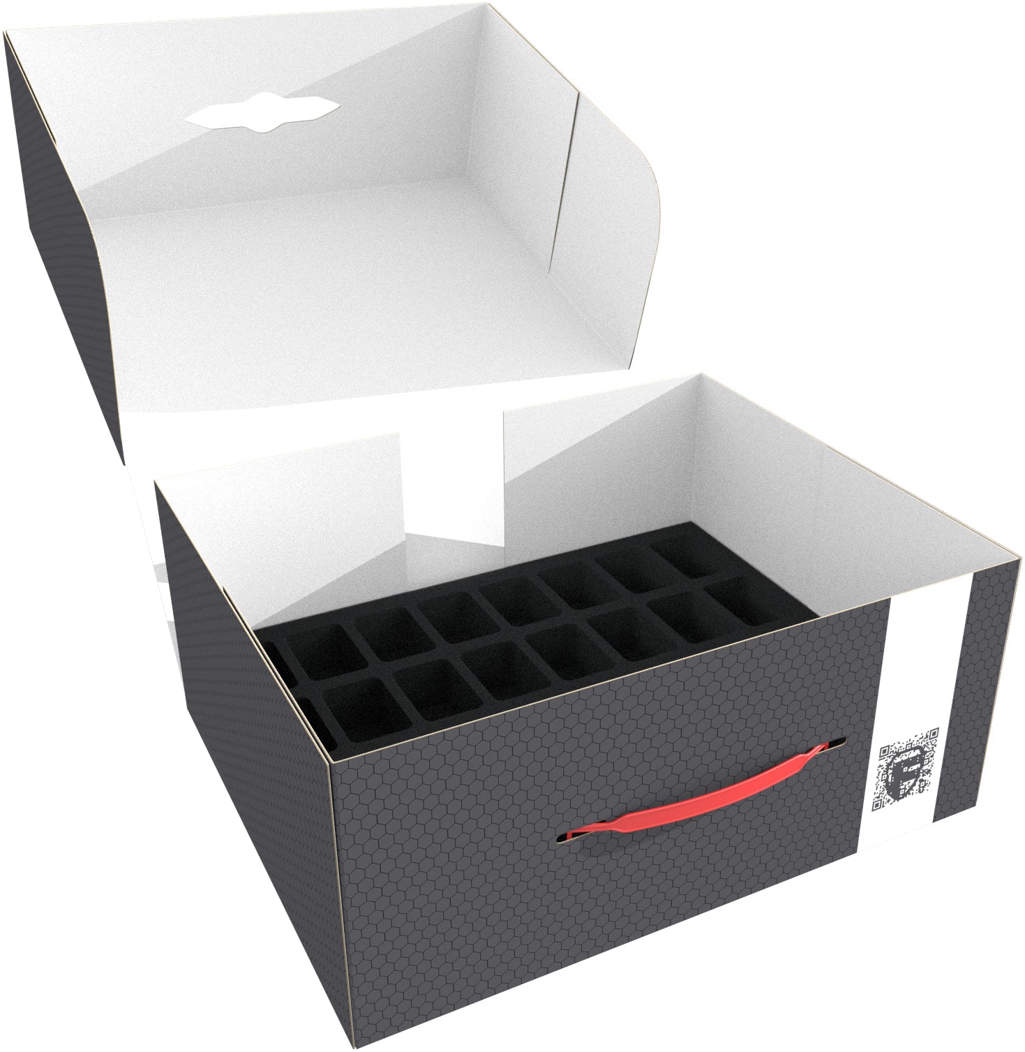 The Storage Box FSLB150, made of coated, double-walled cardboard, is not only pleasantly light but also particularly robust. With the plastic carrying handle, you can easily transport your miniatures.