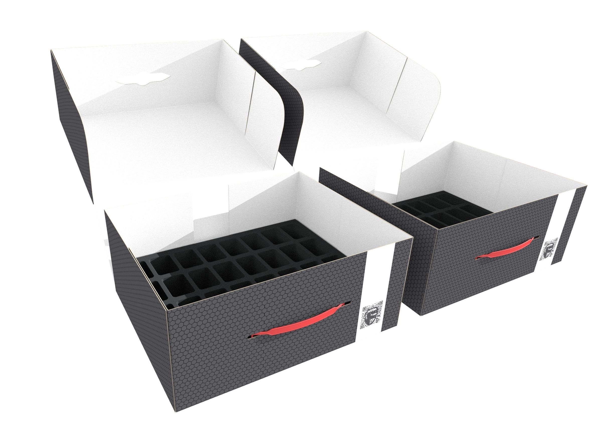 The Storage Boxes - made of coated, double-walled cardboard - are not only light but also particularly stable and therefore ideal for storing the miniatures and foam mats safely and dust-proof. With the plastic carrying handle they can also be transported easily.