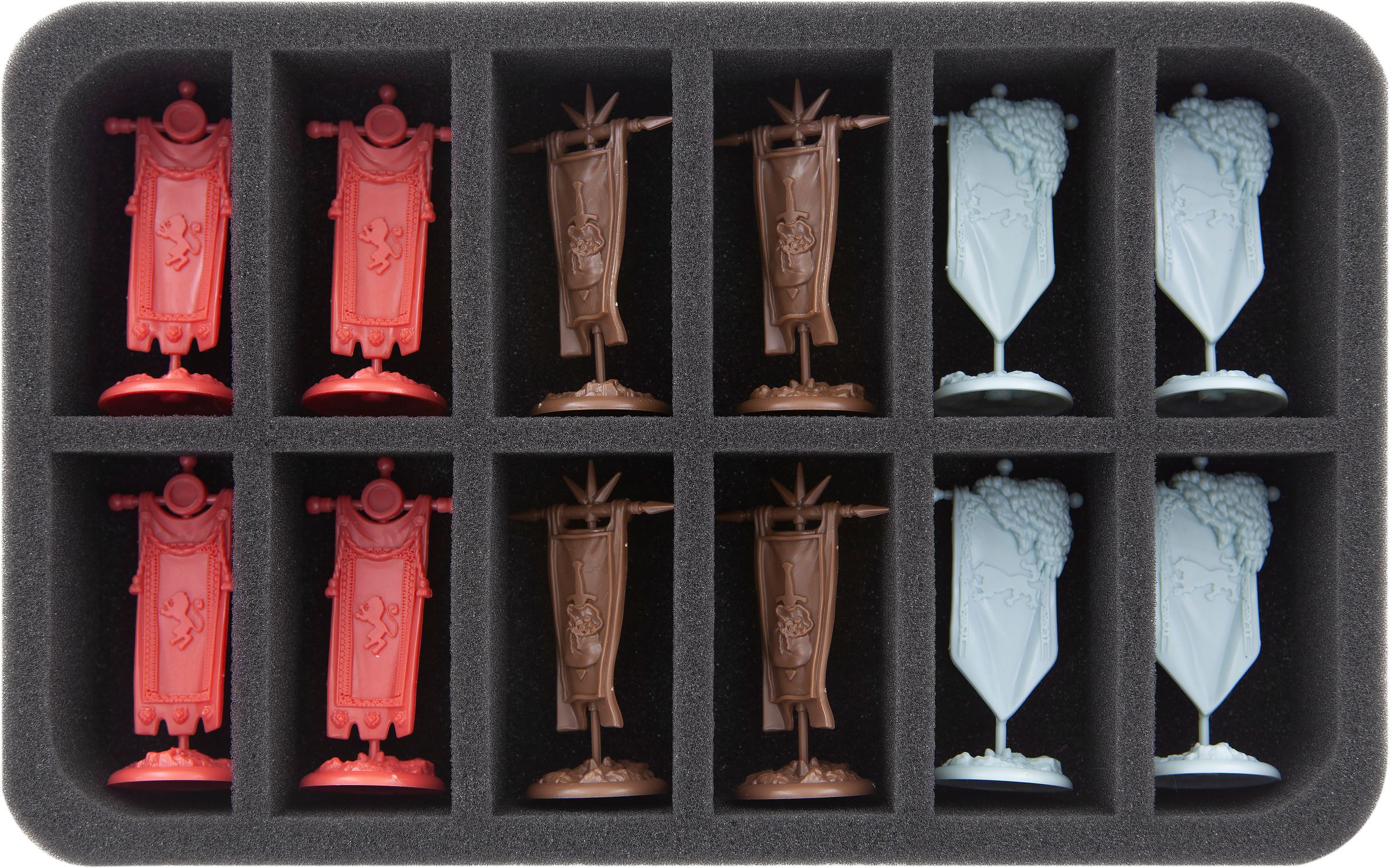 With the additional 2 Half-Size foam trays you also have the possibility to store the Deluxe Activation Tokens in the form of plastic banners for the houses Lannister and Stark. Of course you can also fill these two mats with more miniatures from the Kickstarter campaign instead.