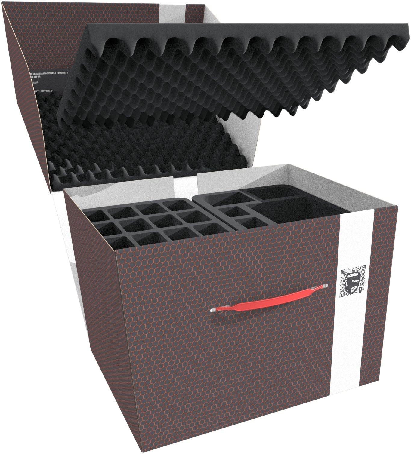 The Storage Box FSLB250 is made of coated, double-walled cardboard. This makes it not only pleasantly light, but also particularly tear-resistant and stable. With the matching foam trays, miniatures and game material can be stored safely and dust-protected and can also be transported effortlessly with the plastic carrying handle.