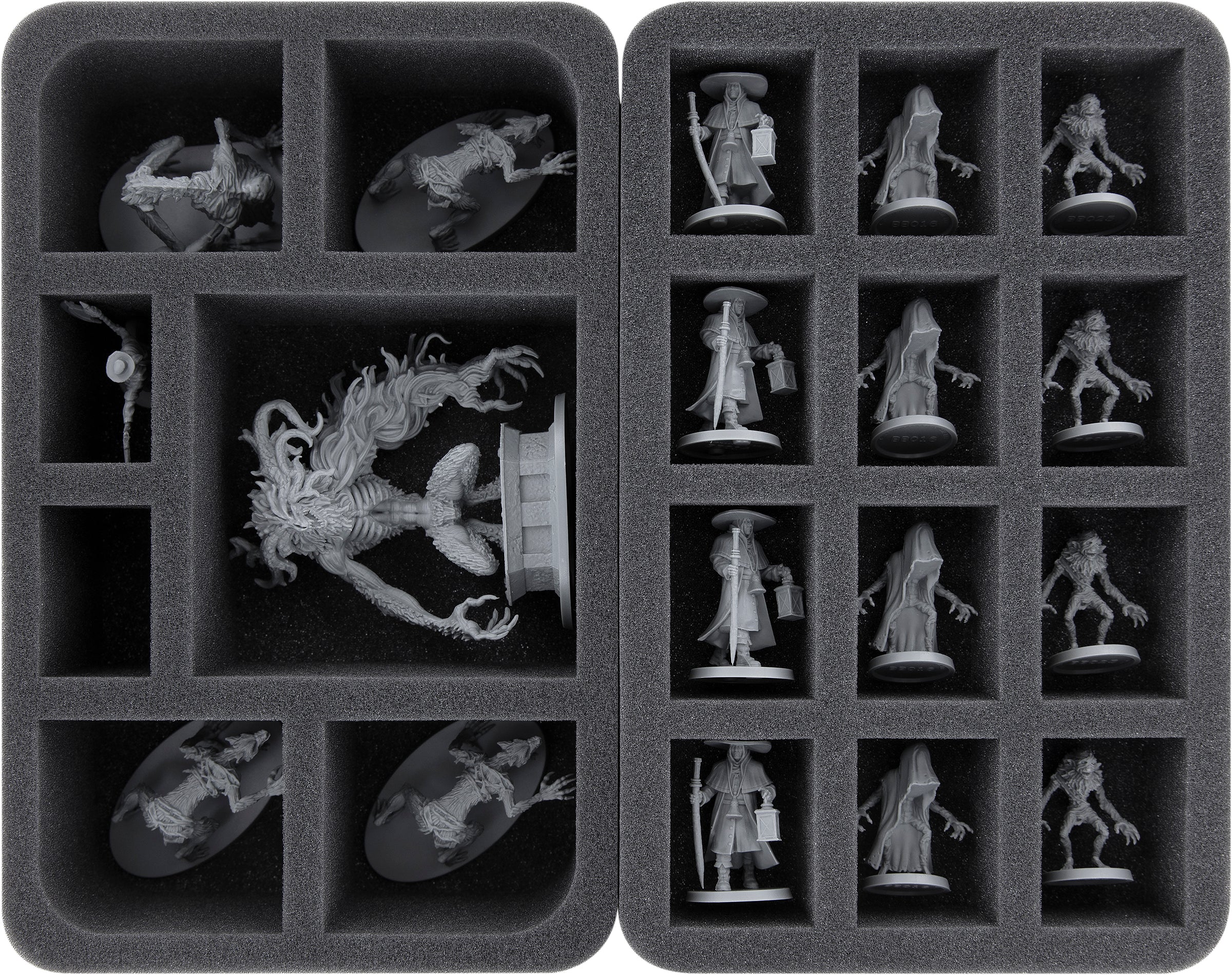 In the dark alleys of Yharnam many dangers await you. Angry mobs and mighty beasts endanger your life. Snapped-off parts, ugly scratches, and paint chips threaten your painted miniatures. To protect your miniatures, we've packed seven Half-Size foam inserts into the box. Each model, no matter if a huge Cleric Beast, one of the Hunters, or a Hunter Mob will find a suitable compartment in the box. The precisely cut compartments prevent the figures from sliding around and bumping into each other during transport. This protects filigree details and your painted models will not be affected by abrasion and scratches. Thus, you only have to fear the monsters behind the next corner.