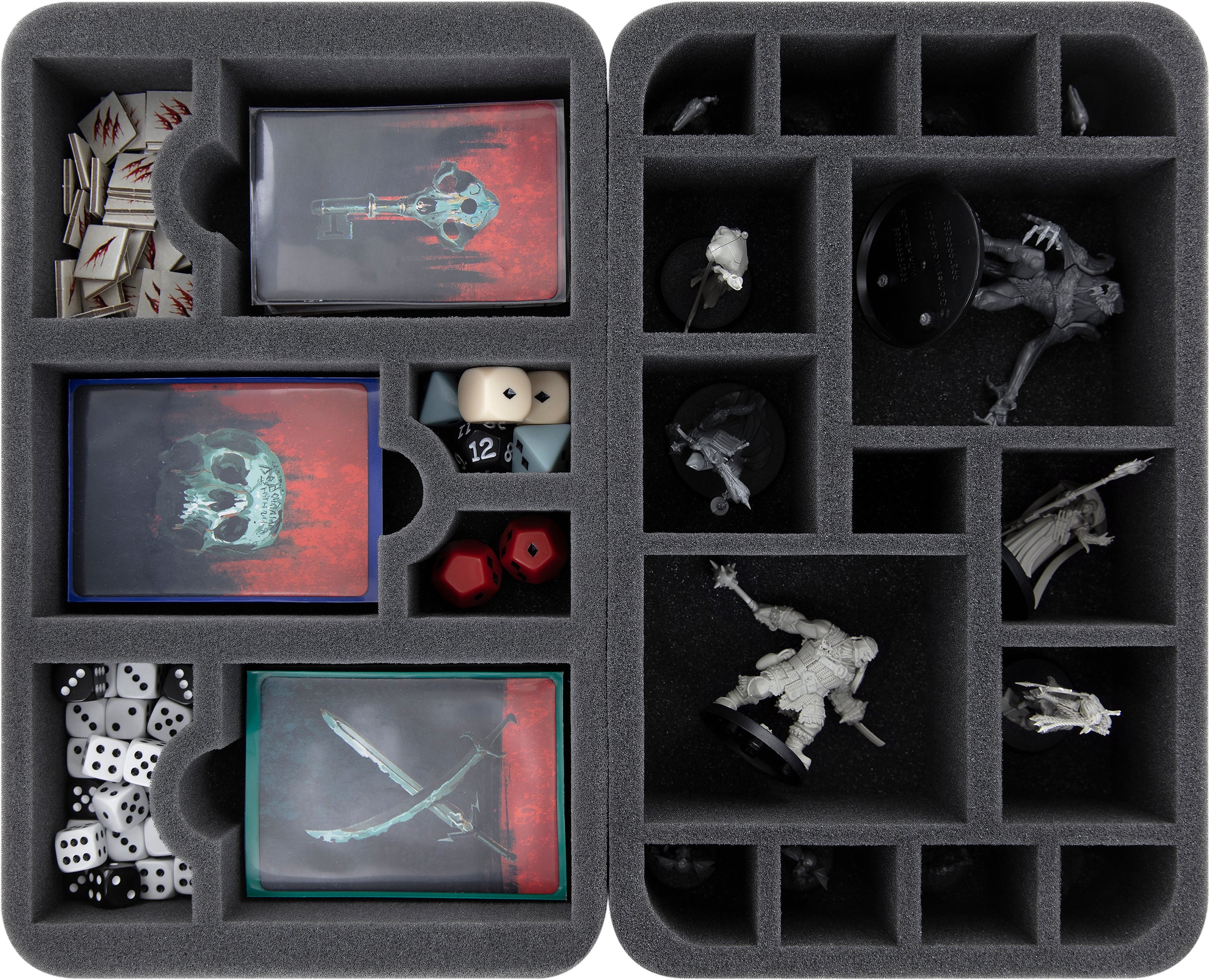 The hero, hostile and object models from the core box are spread over two Full-Size and two Half-Size inserts. Be it the giant Vargskyr, the bulky Brutogg Corpse-Eater or the Bat Swarms and the small Gravestones - each model gets the right compartment (see example images in the product description). In the custom-fitting compartments, your finely detailed figures are well kept and protected from damage during transport.