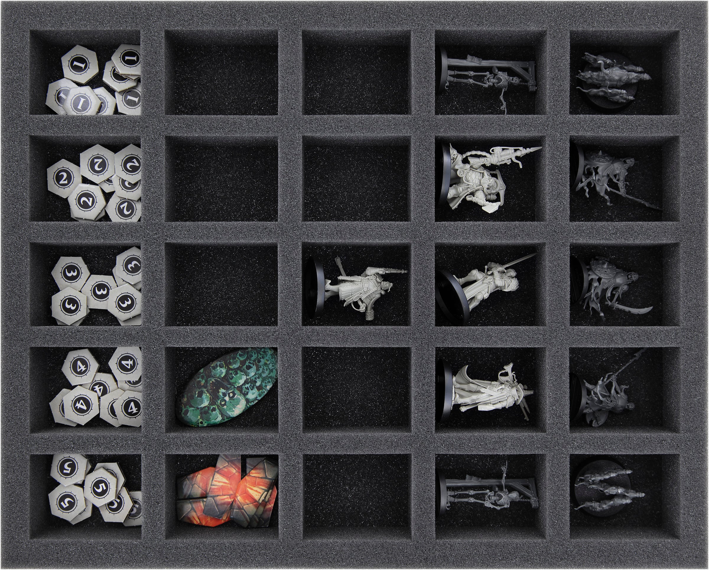 - 2 Full-Size foam trays each with 25 compartments for miniatures (FSLQ040BO)