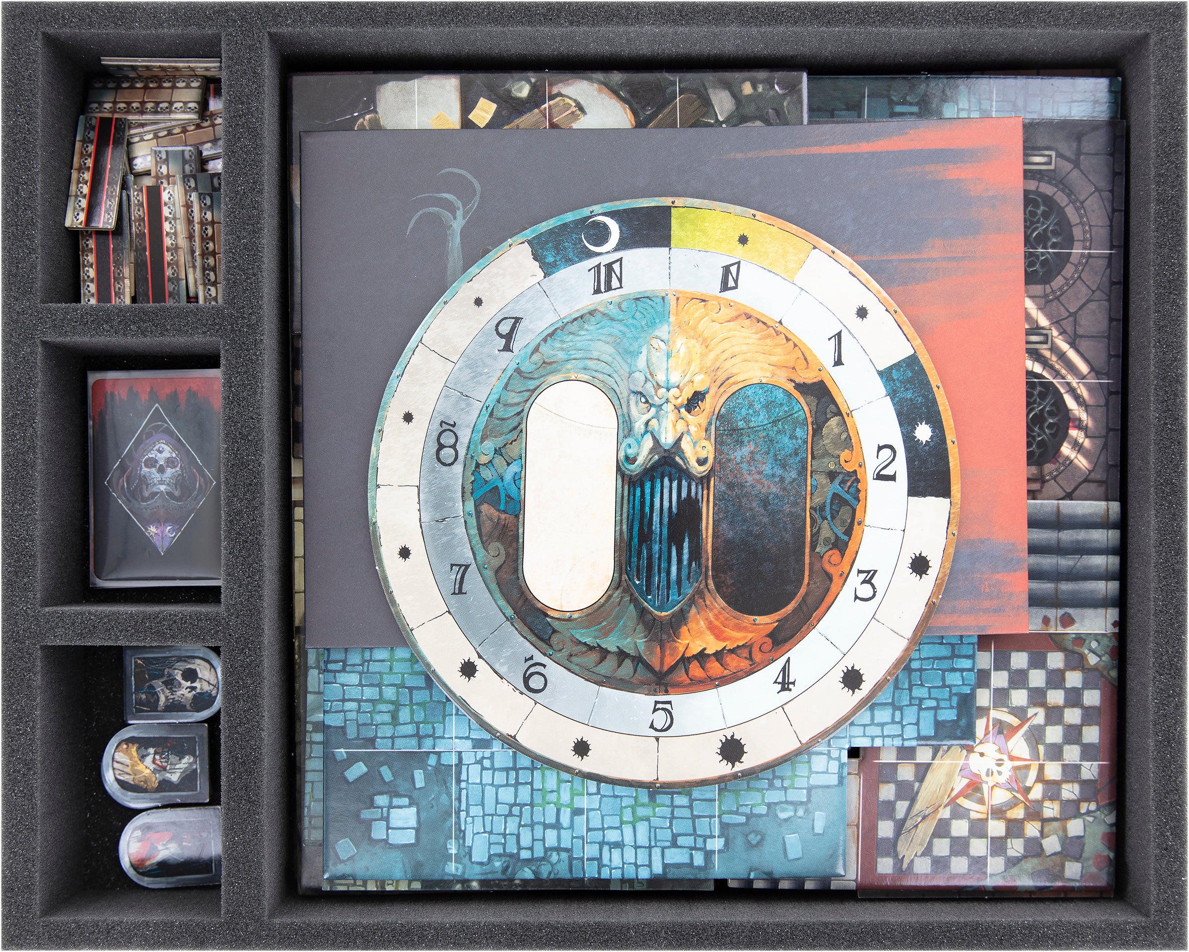 To store the larger cardboard pieces, such as the Board Tiles, and the small game cards, use the Full-Size insert with the large compartment and the three small compartments.