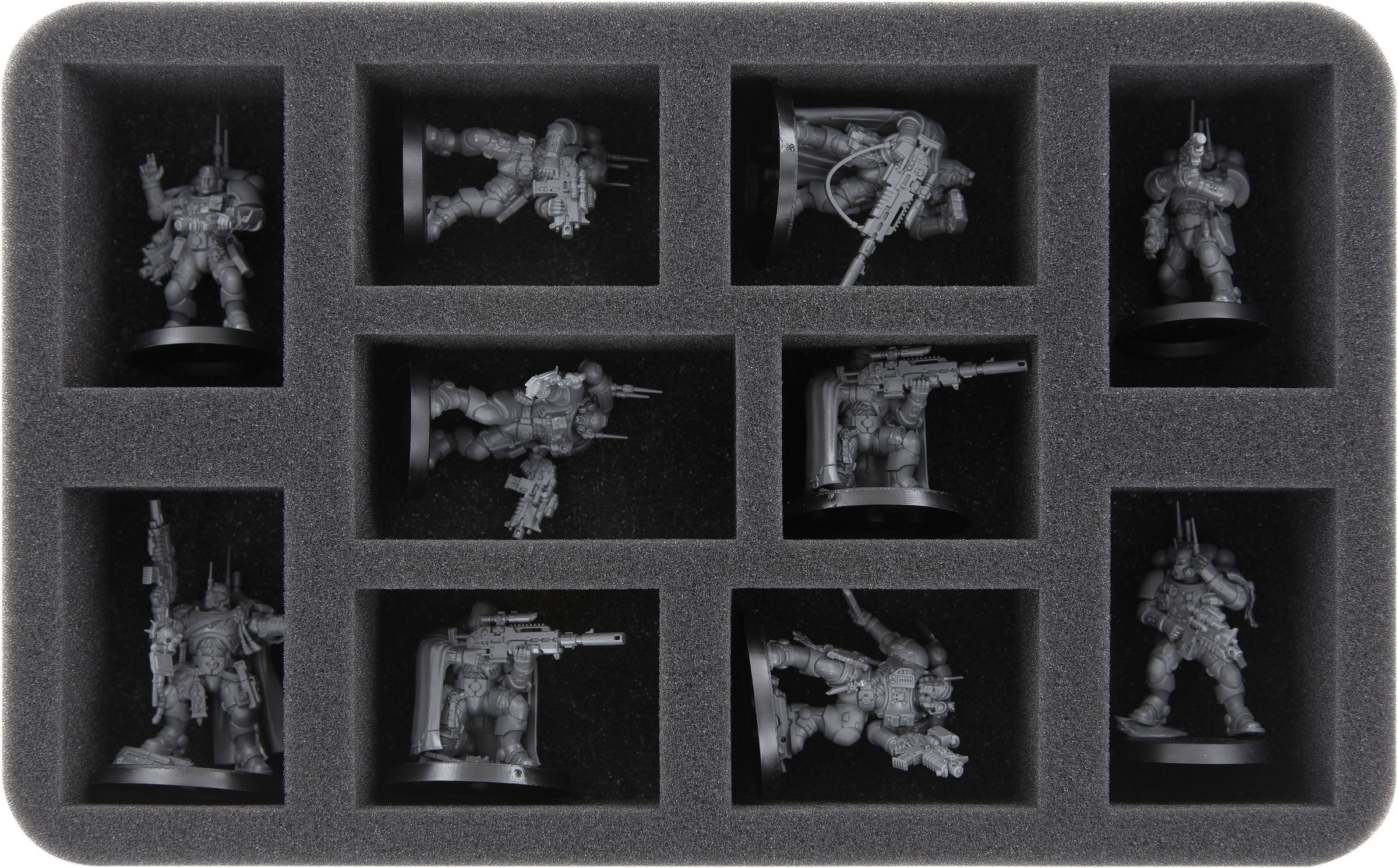 Standard-infantry or models with protruding poses, can be stored on the 25-compartment foam tray.