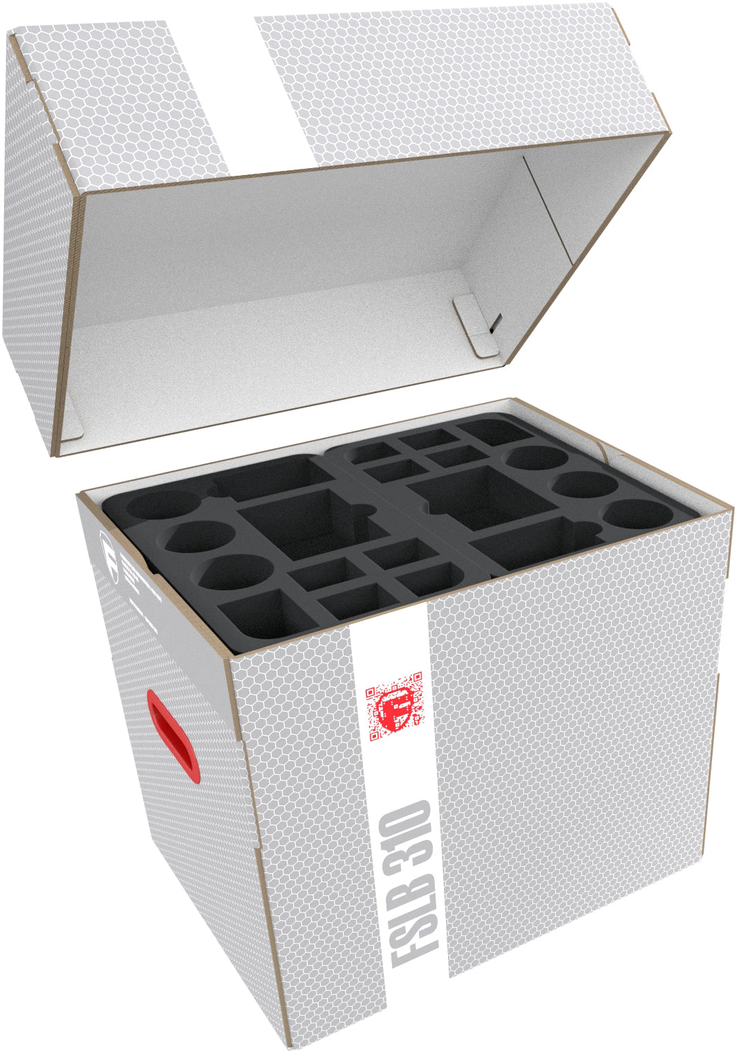 The Storage Box FSLB310 is made of coated, double-walled cardboard. This makes it not only pleasantly light but also very tear-resistant and stable. The attachable lid reliably protects the contents from dust and other external influences. With the appropriate foam trays, miniatures, game material, and all other goods can be stored safely — and conveniently transported with the two plastic-reinforced carrying handles on the sides.