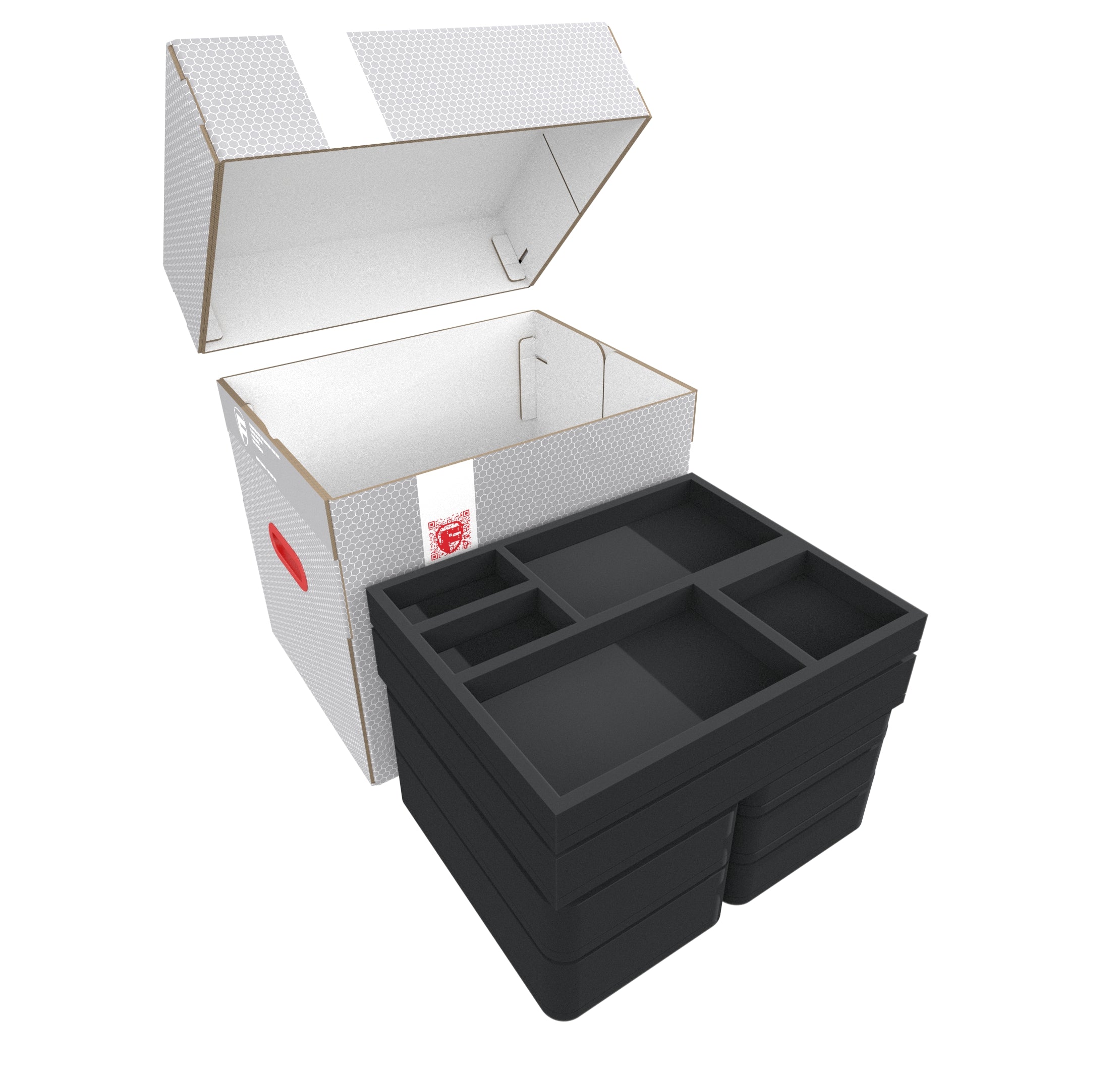 The Storage Box FSLB310 is made of coated, double-walled cardboard. This makes it not only pleasantly light, but also very tear-resistant and stable. The attachable lid reliably protects the contents from dust and other external influences. With the appropriate foam trays, miniatures, game material and all other goods can be stored safely - and conveniently transported with the two plastic-reinforced carrying handles on the sides.