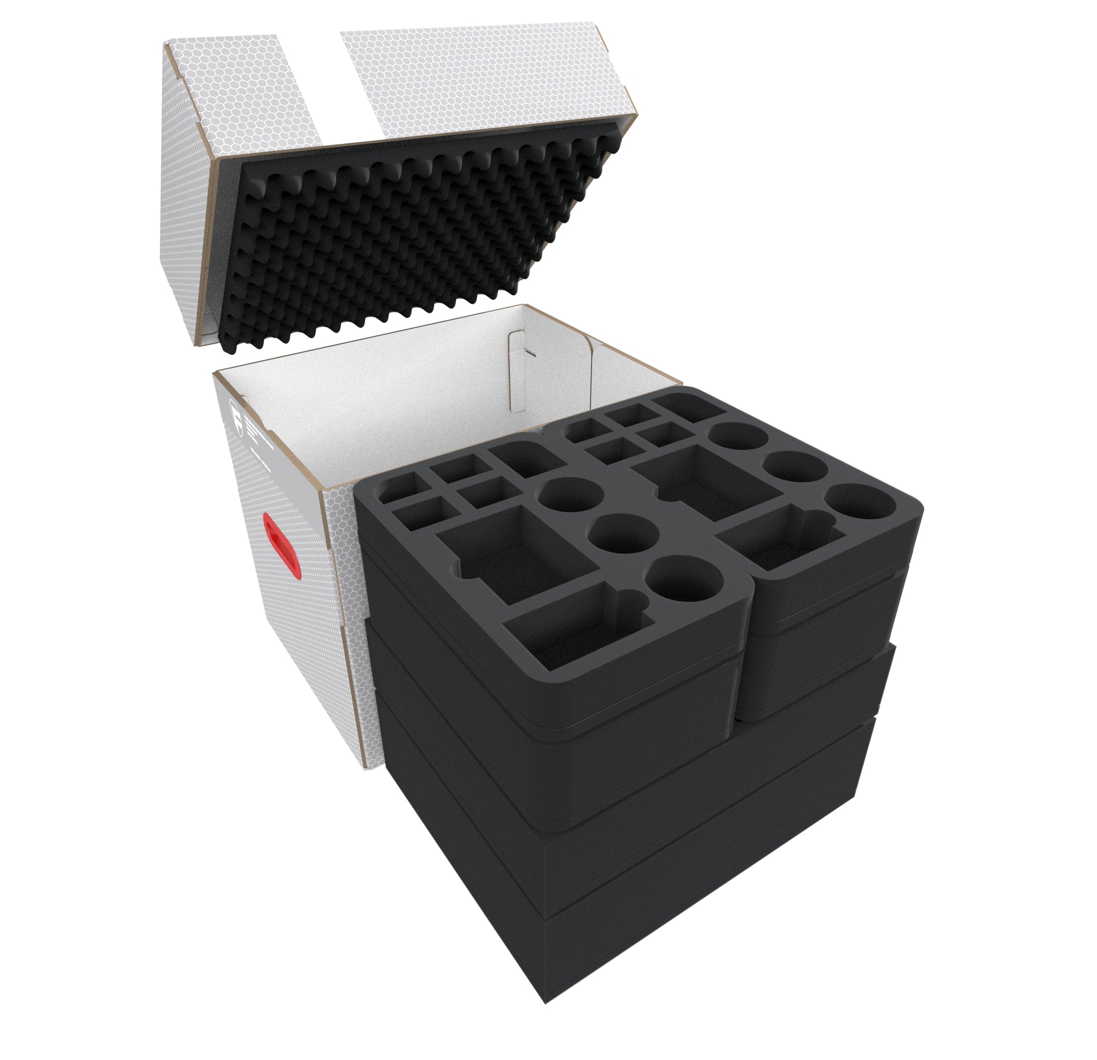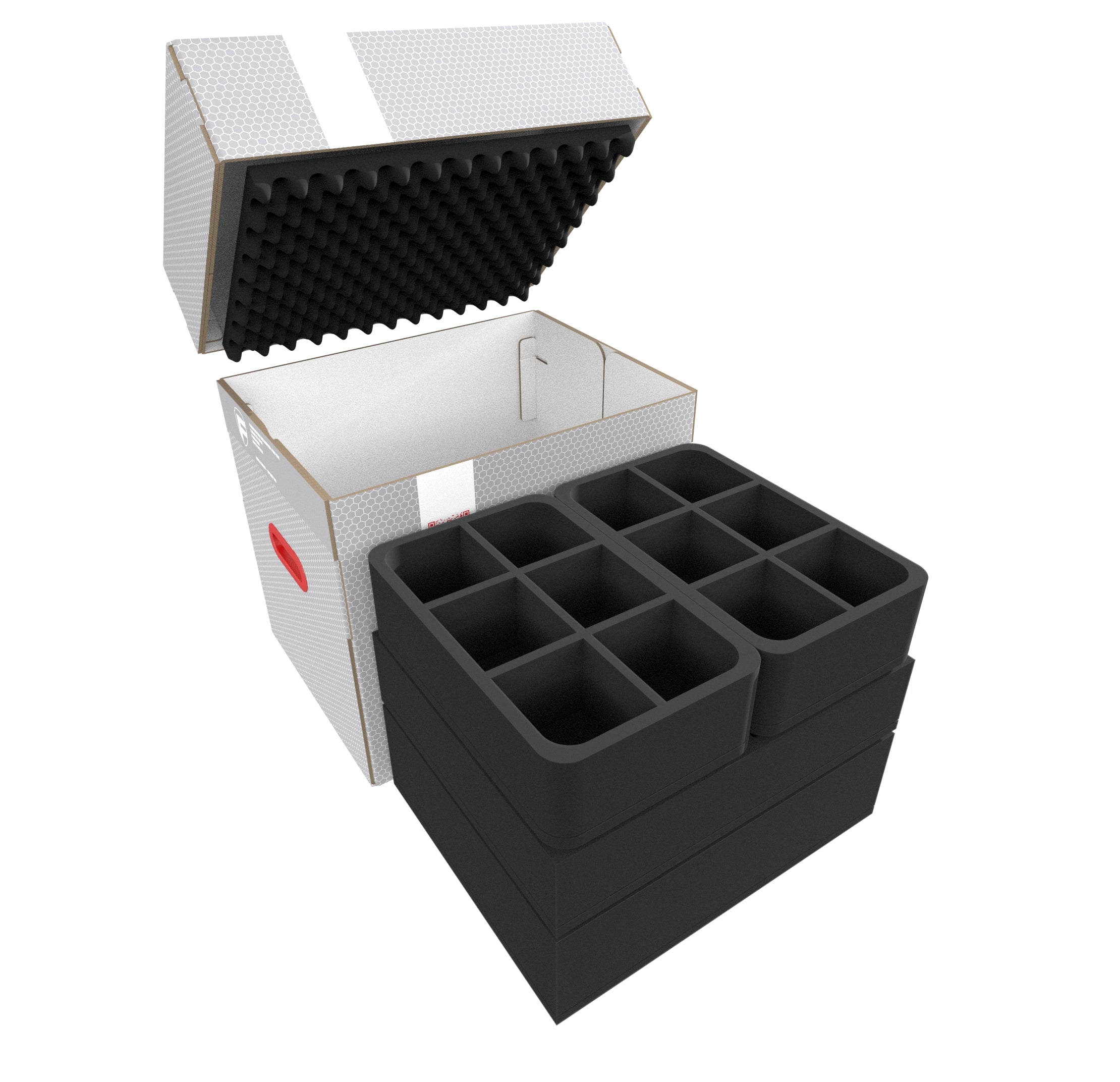 • 2 Half-Size foam trays with 6 compartments each for miniatures (HSMECO075BO)