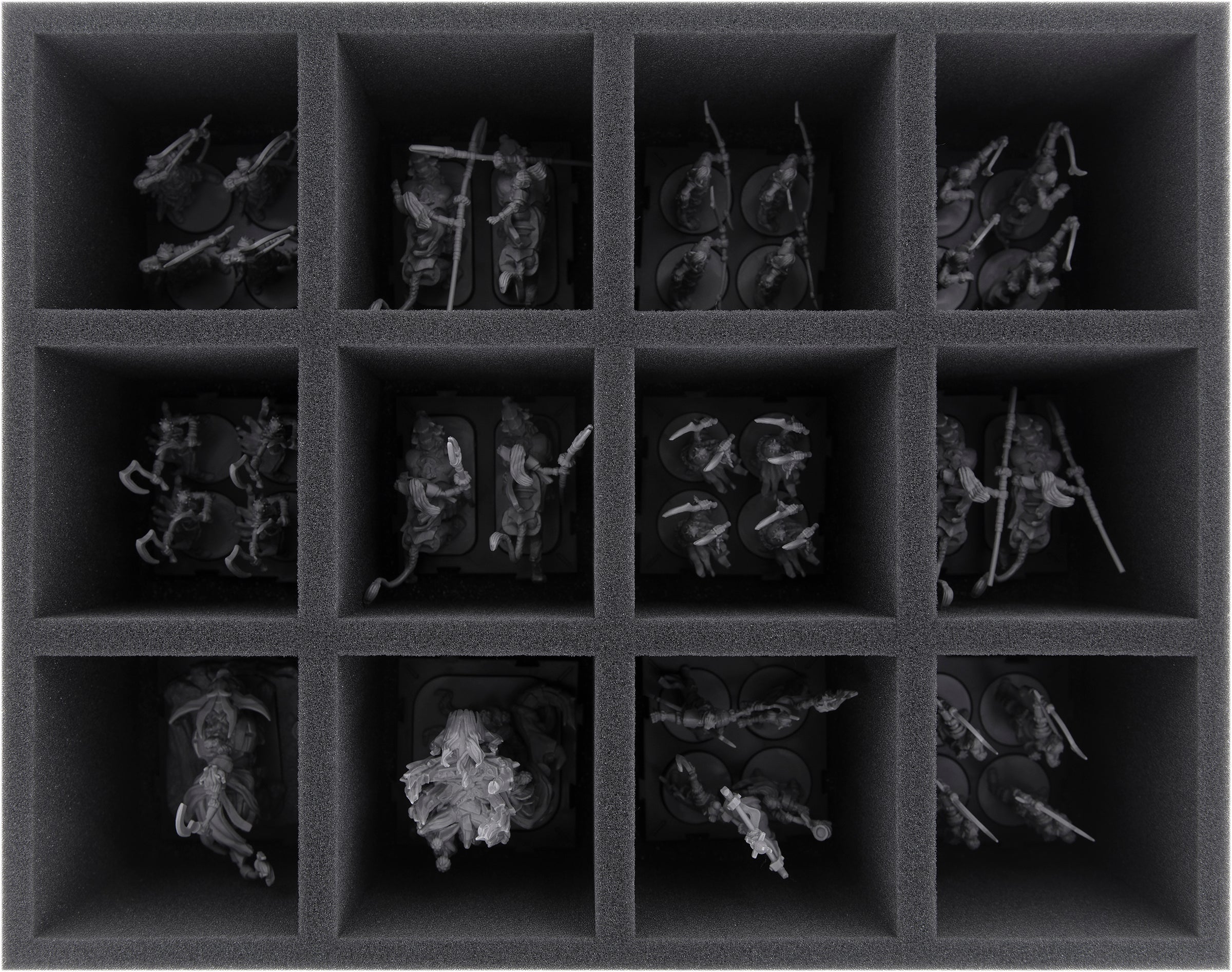 FSMEPQ100BO: The Full-Size tray with 12 same-sized compartments is particularly suitable for units on their movement trays with high elements, such as Latari Elves Infantry Command, Aymhelin Scions, and Aliana of Summersong