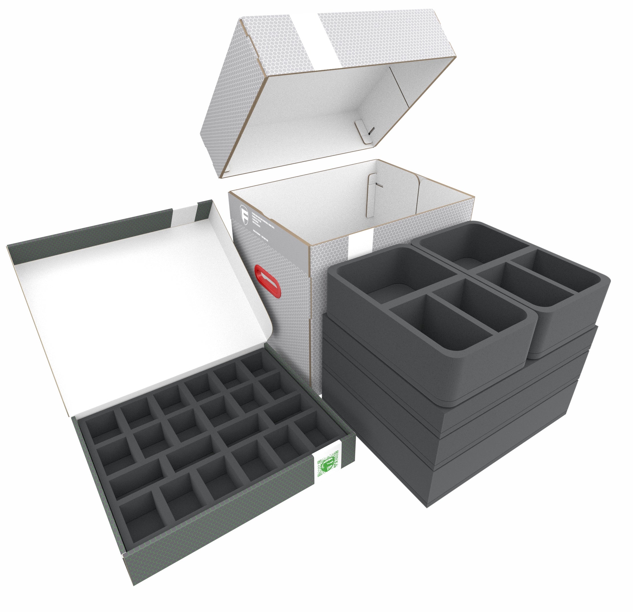 • 2 Half-Size foam trays with 3 compartments each for large miniatures (HSCR080BO)