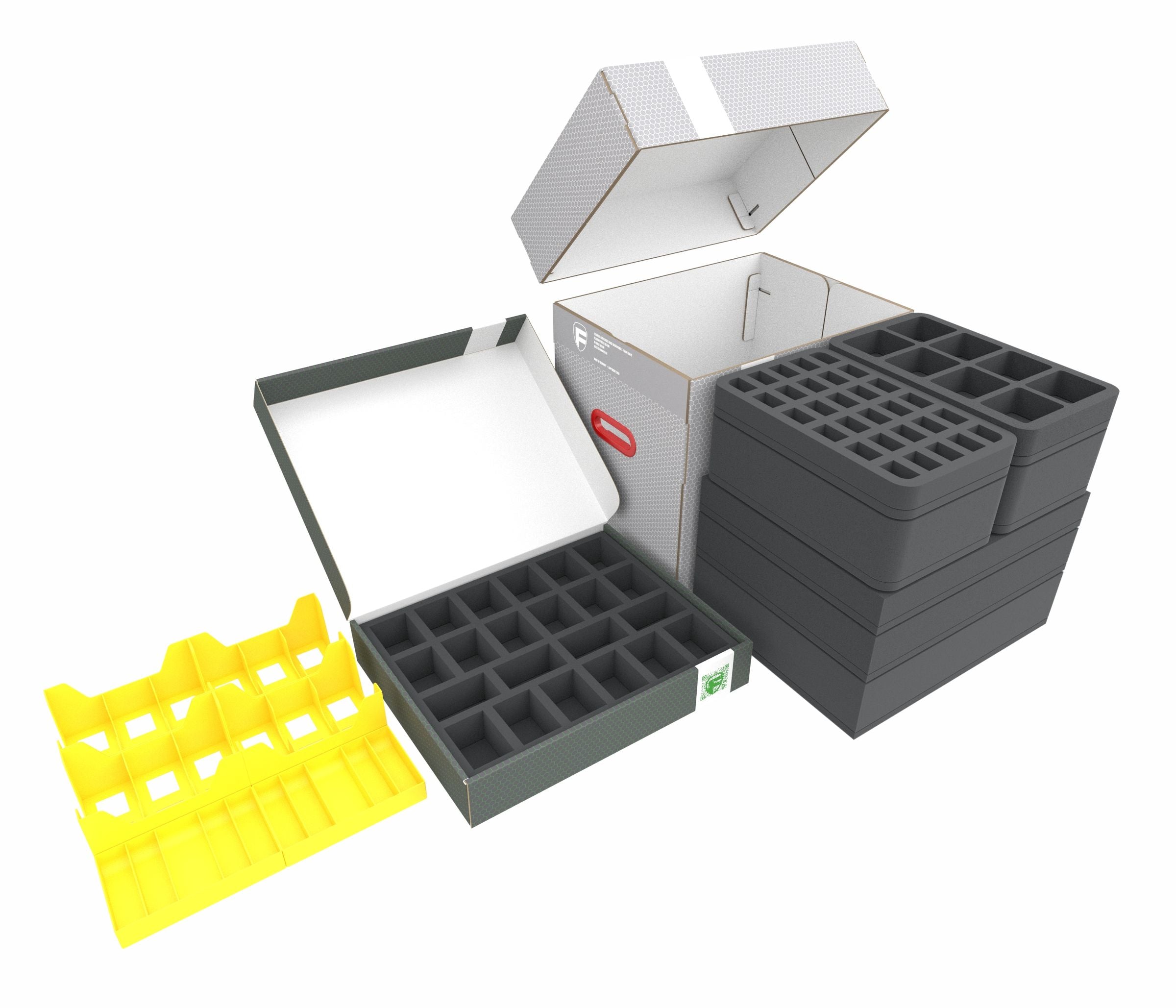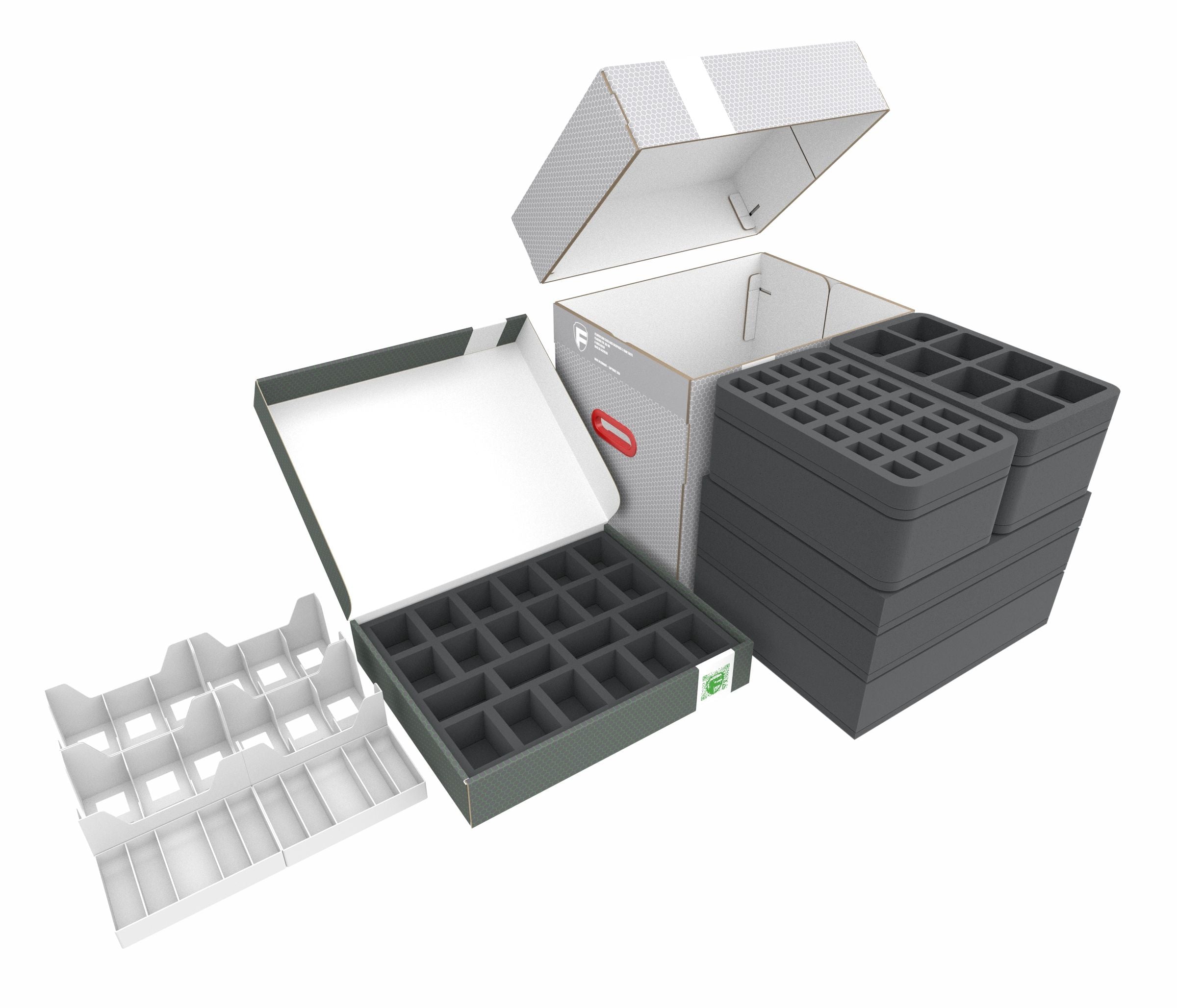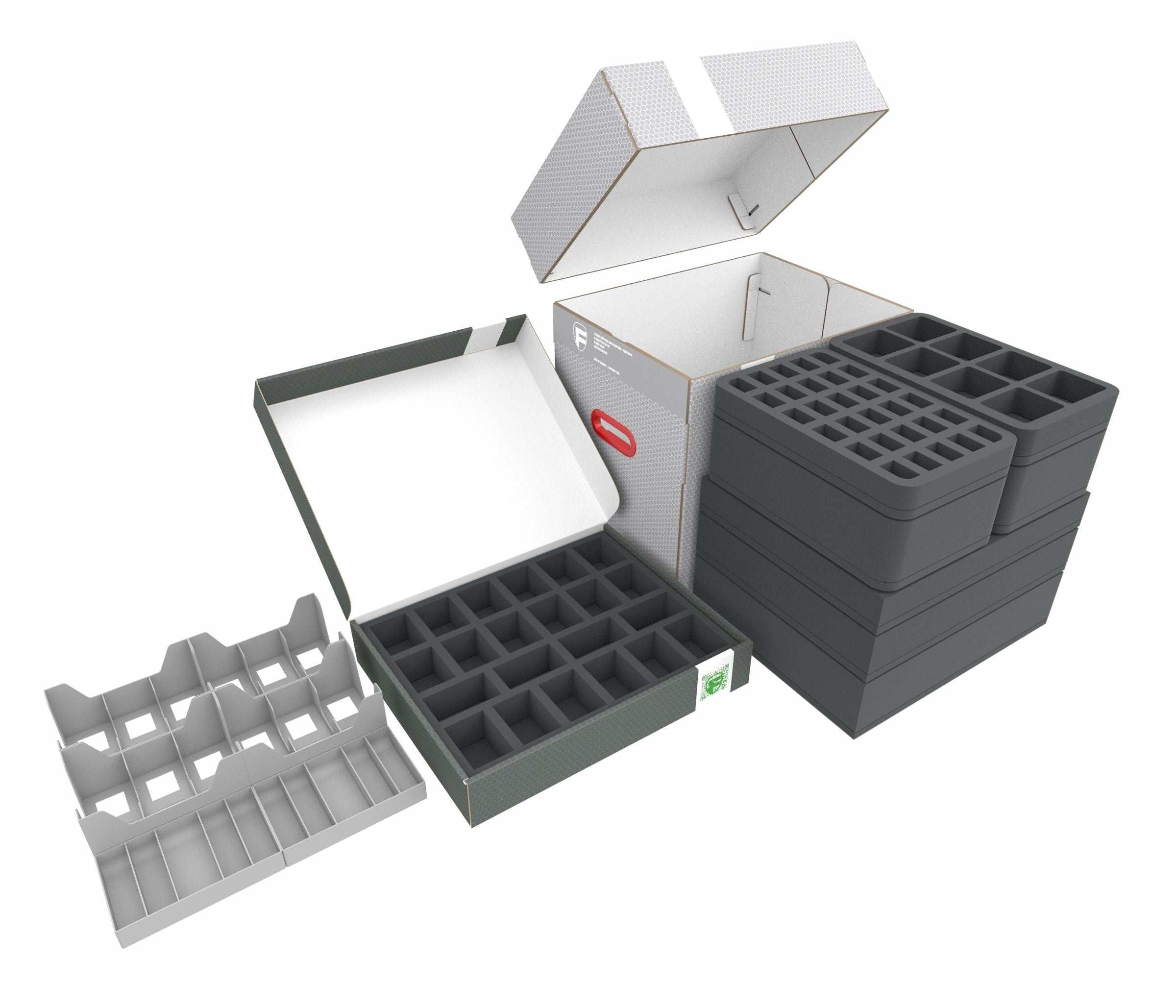 The Storage boxes FSLB310 and FSLB055 + Organizer Insert, filled with premium Feldherr foam trays, cardholders and tokentrays, ensure that all 86 miniatures, game cards, dice and tokens are securely protected. Instead of juggling multiple boxes at once, you’ll only need two hands to transport this Storage box set, ensuring your miniatures arrive at the battlefield intact.