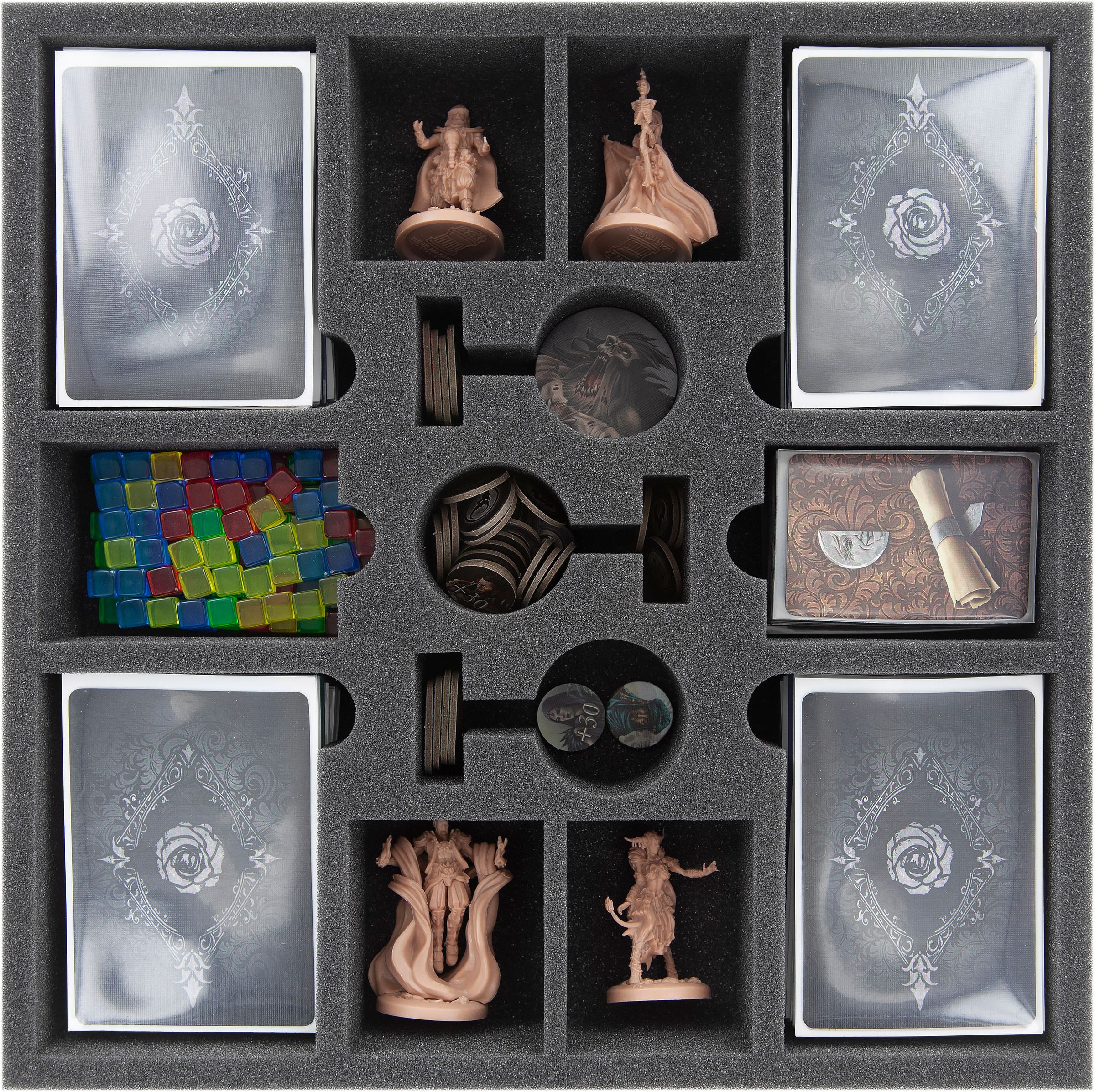 • 1 foam tray with 34 compartments for miniatures, tokens and rose pins of the core game (AFMEDY040BO)
