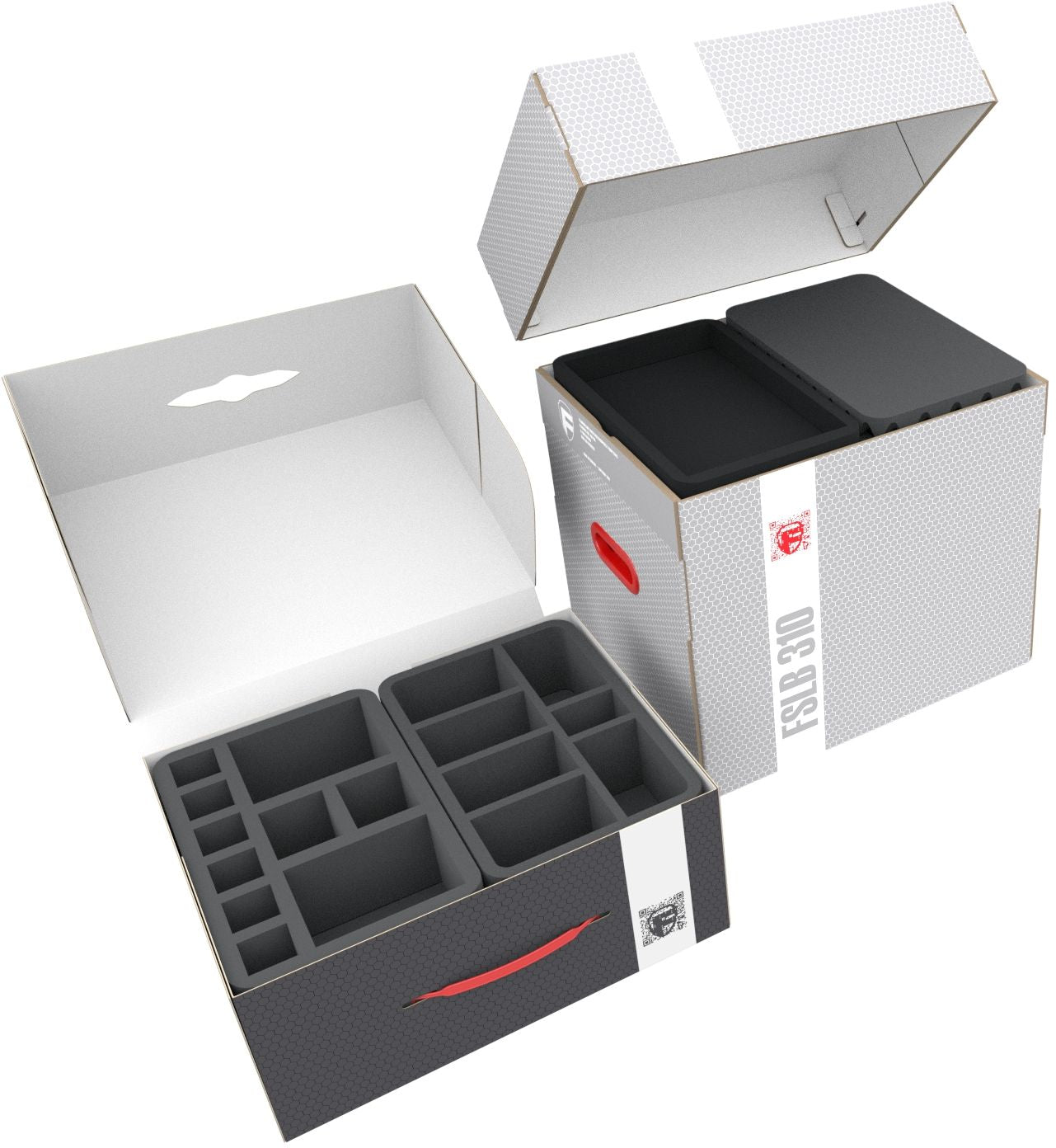 The TCHS105 card box and foam trays fit exactly into the large Storage Box FSLB310. The Feldherr Storage Boxes FSLB310 and FSLB150 are made of coated, corrugated cardboard. This means they are pleasantly light, particularly tear-resistant, and stable. The attachable lid of the FSLB310 reliably protects the contents from dust and other external influences. The FSLB310 can be easily transported with the two plastic-reinforced carrying handles on the sides.