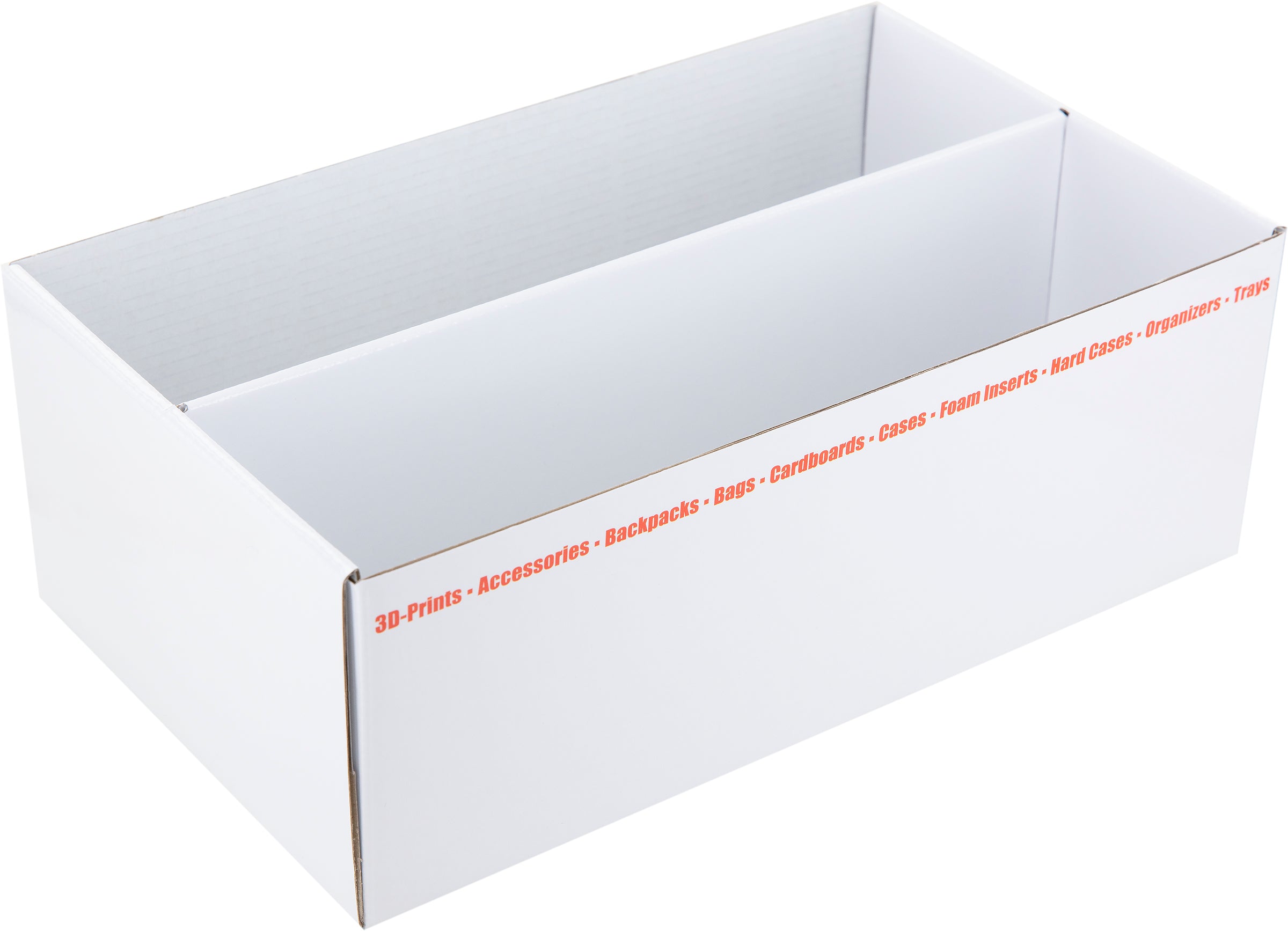 The base is made of white, coated cardboard. A partition in the middle of the box divides it into two equally sized compartments. This allows the cards to be lined up neatly without getting mixed up during transport.