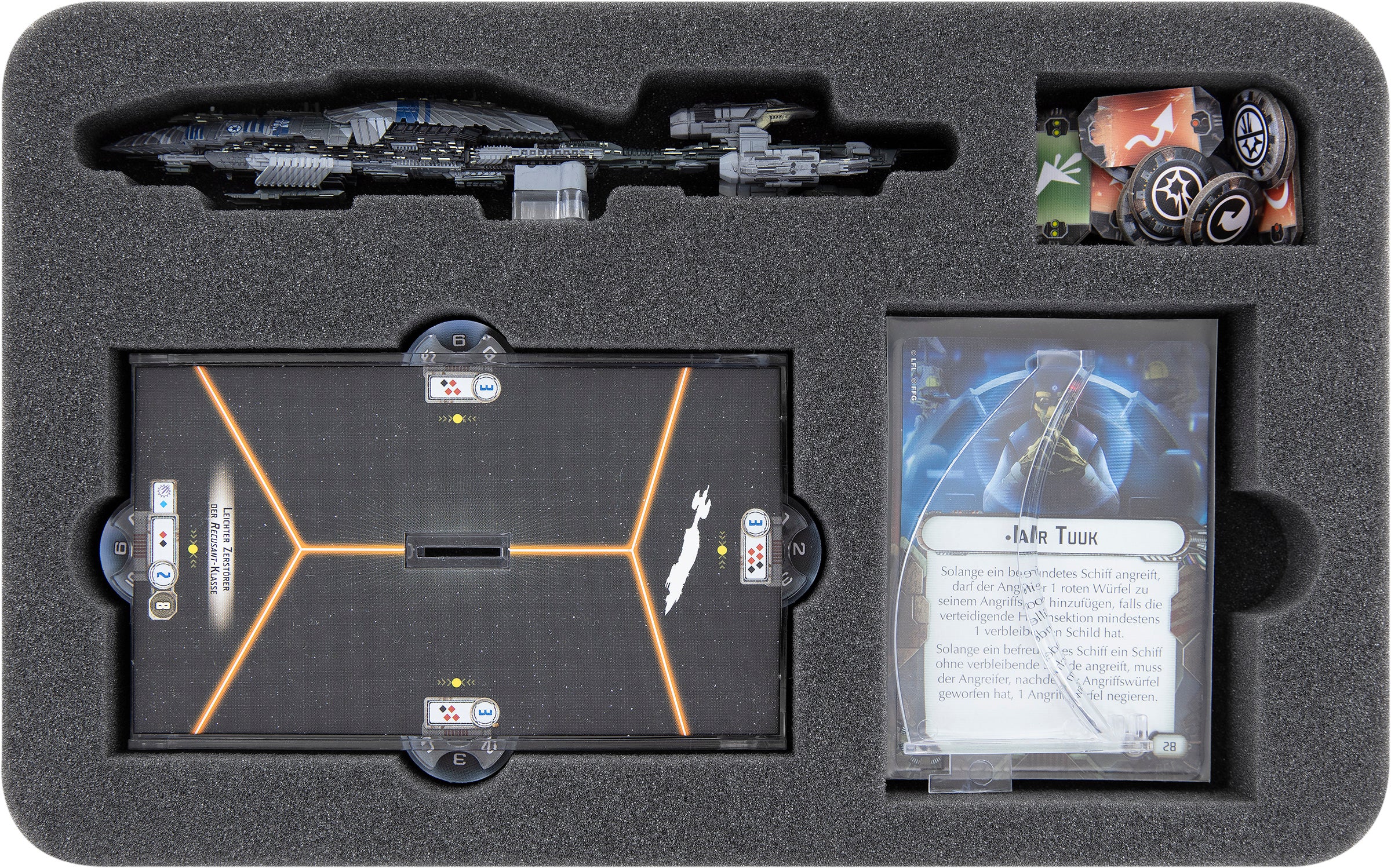The Ship and Upgrade cards can be stored in the card compartment with the single finger-thick cutout. Of course, the cards also fit with protective sleeves.