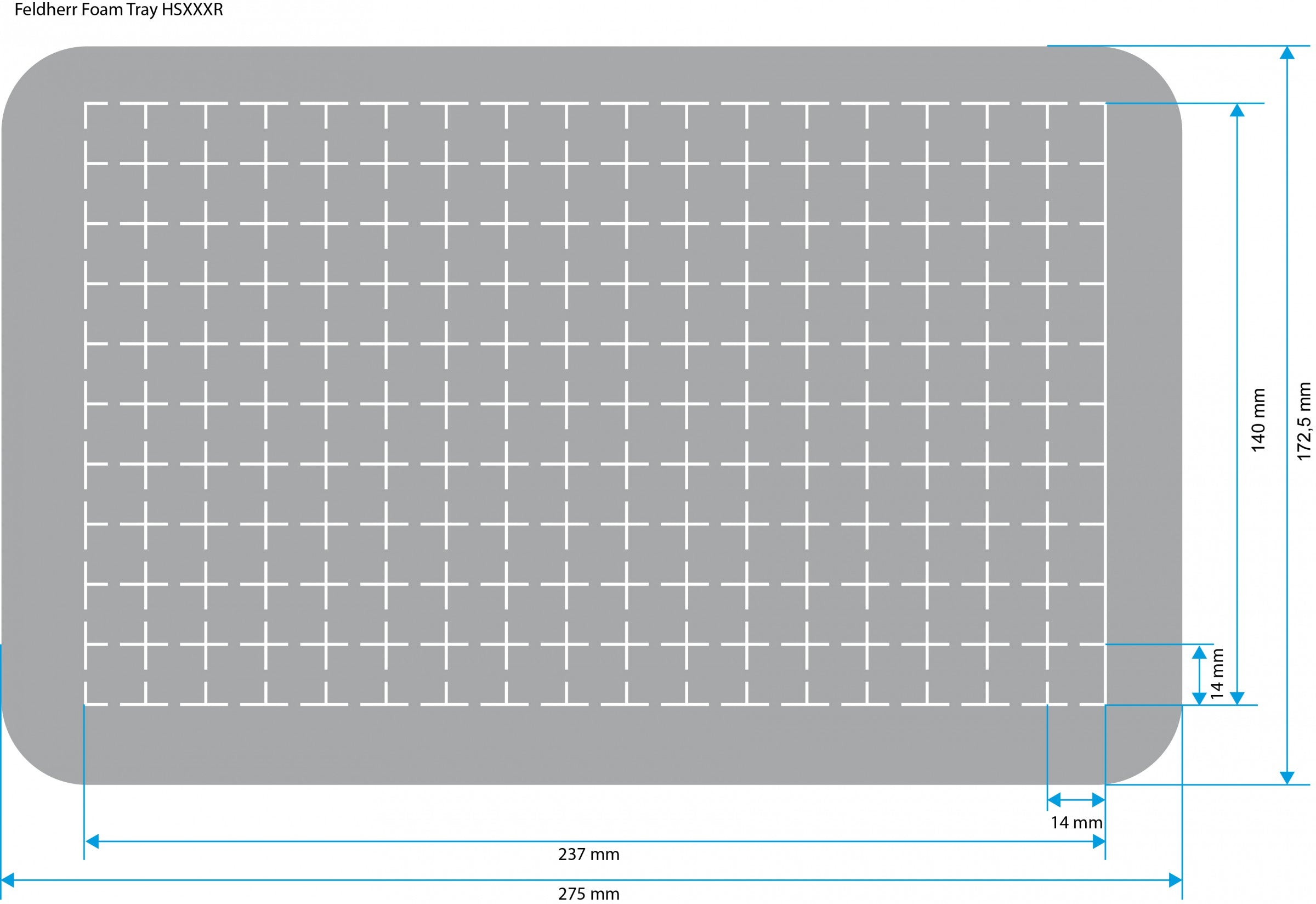 - Dimension of the Feldherr half-size (HS) foam tray: 275 mm x 172 mm x 25 mm height