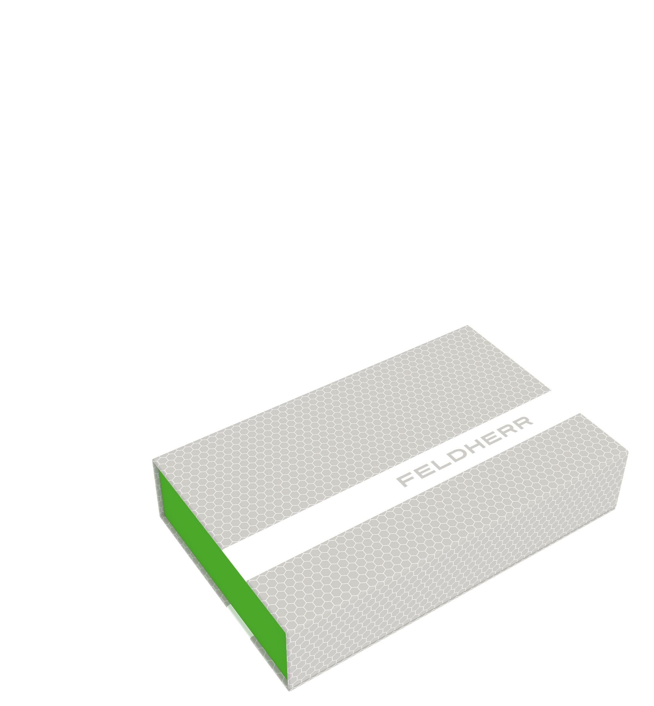 The Magnetic Box is the ideal solution for storage and transport because of its low weight and flat, rectangular shape. It consists of coated solid cardboard in modern Feldherr design. The green box, in which the foam mats are placed, is firmly glued to the casing. This also serves as a lid. Two integrated magnets on the flap and front allow a seamless and easy closing so that nothing gets lost during transport.
