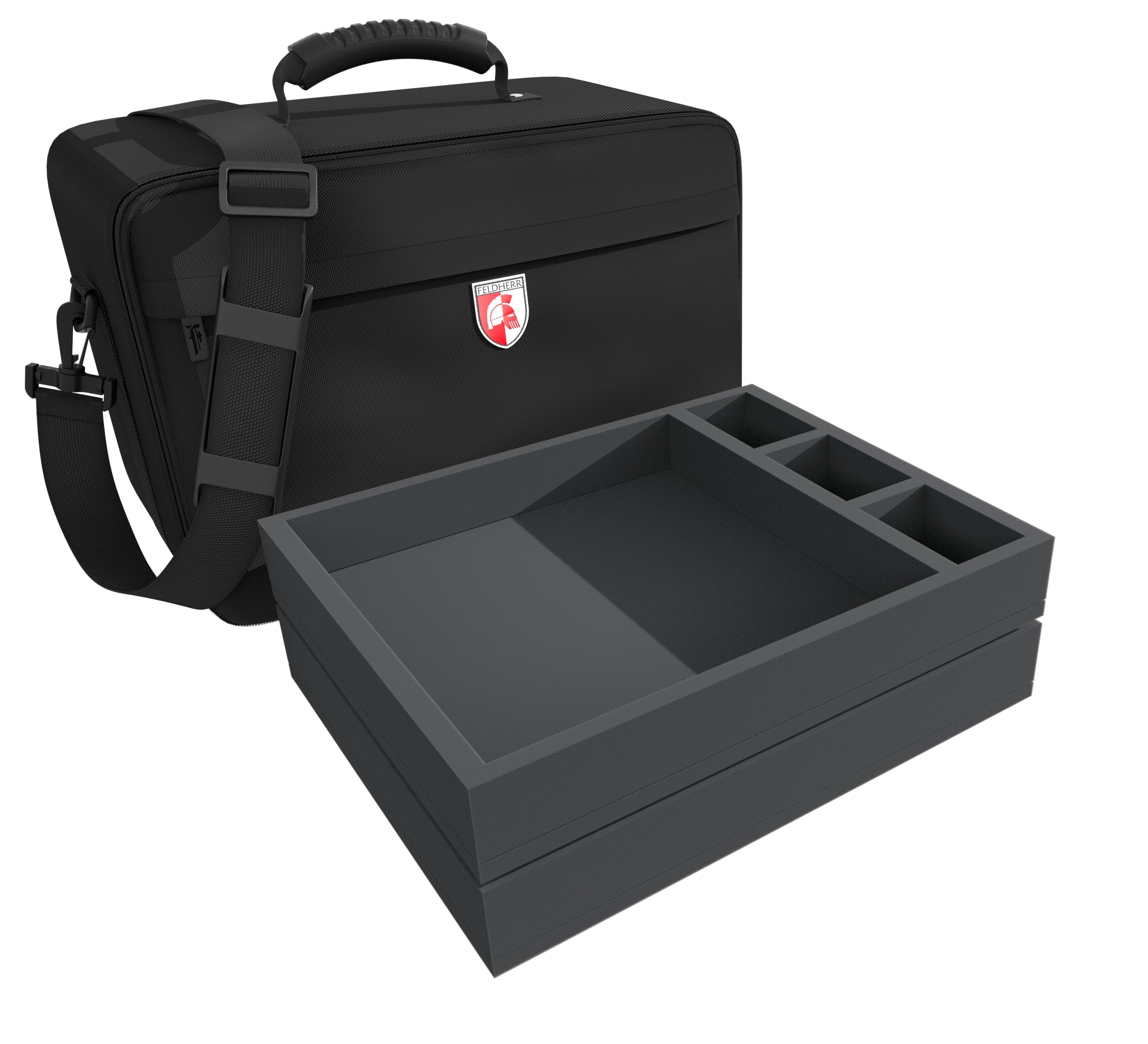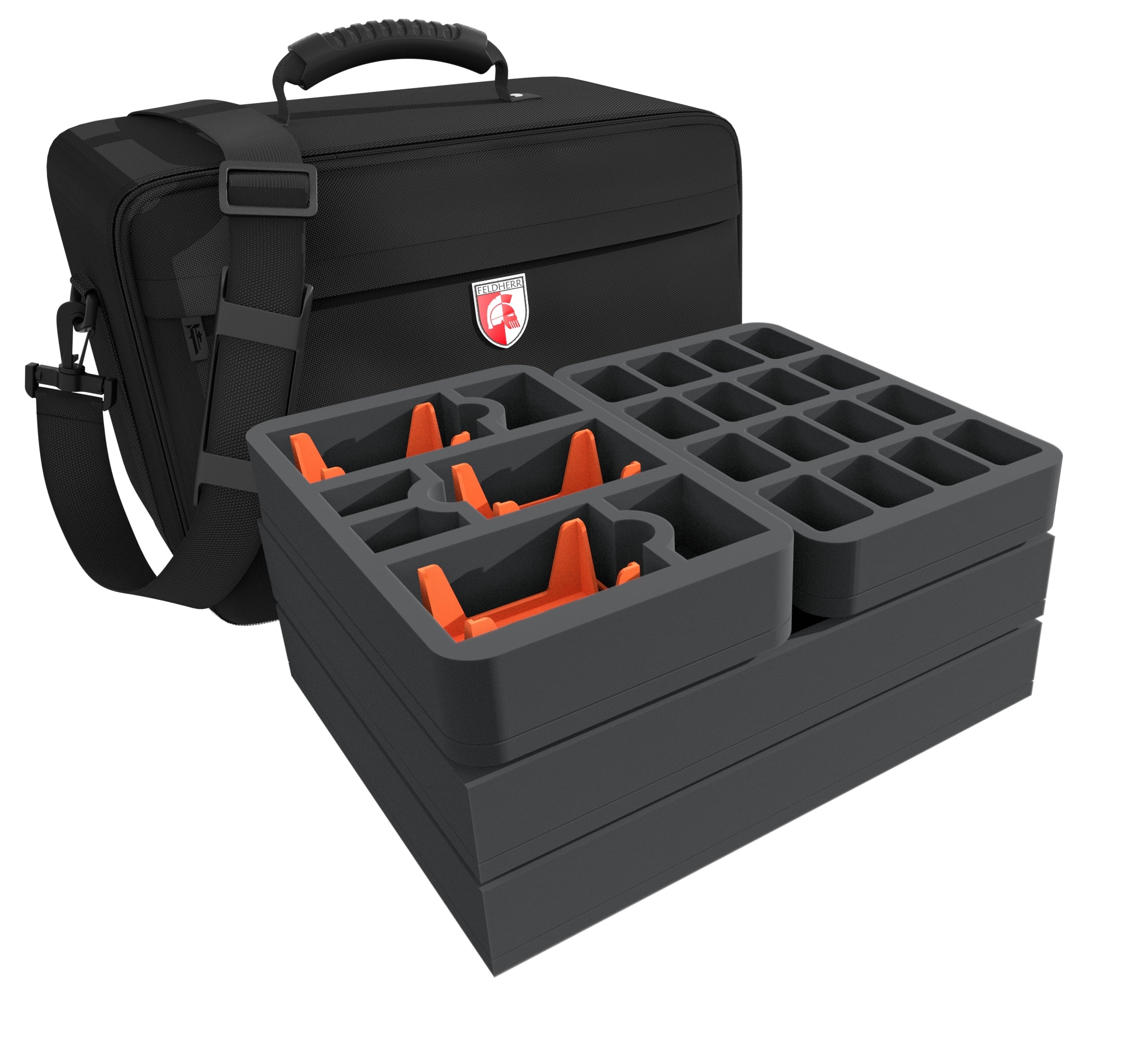 As if life as an undead hero isn't hard enough, Sword & Sorcery: Ancient Chronicles comes with a jam-packed core game box. Countless tokens, tiles, books, cards, and figures need to be properly sorted and stored. Fortunately, we have designed a matching Feldherr MAXI PLUS bag including foam trays and plastic card holders for the core game. It ensures that the entire game material and every miniature can be neatly sorted and securely transported.