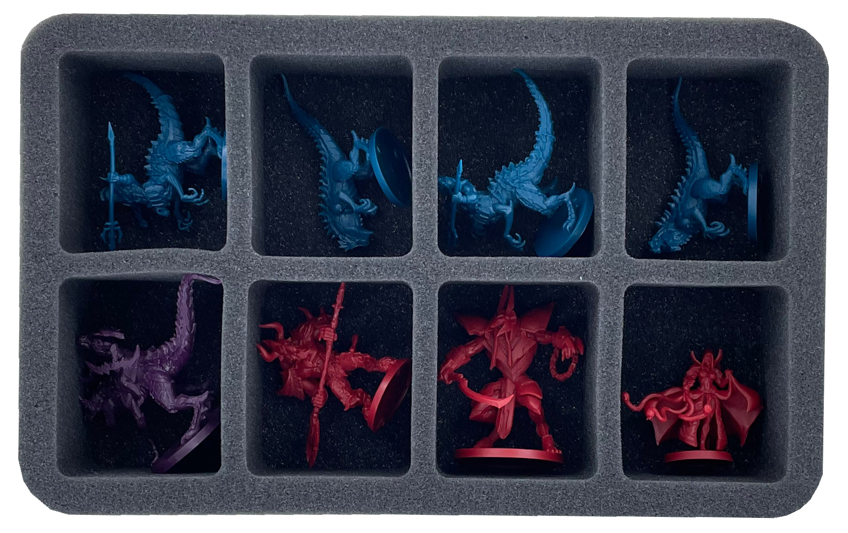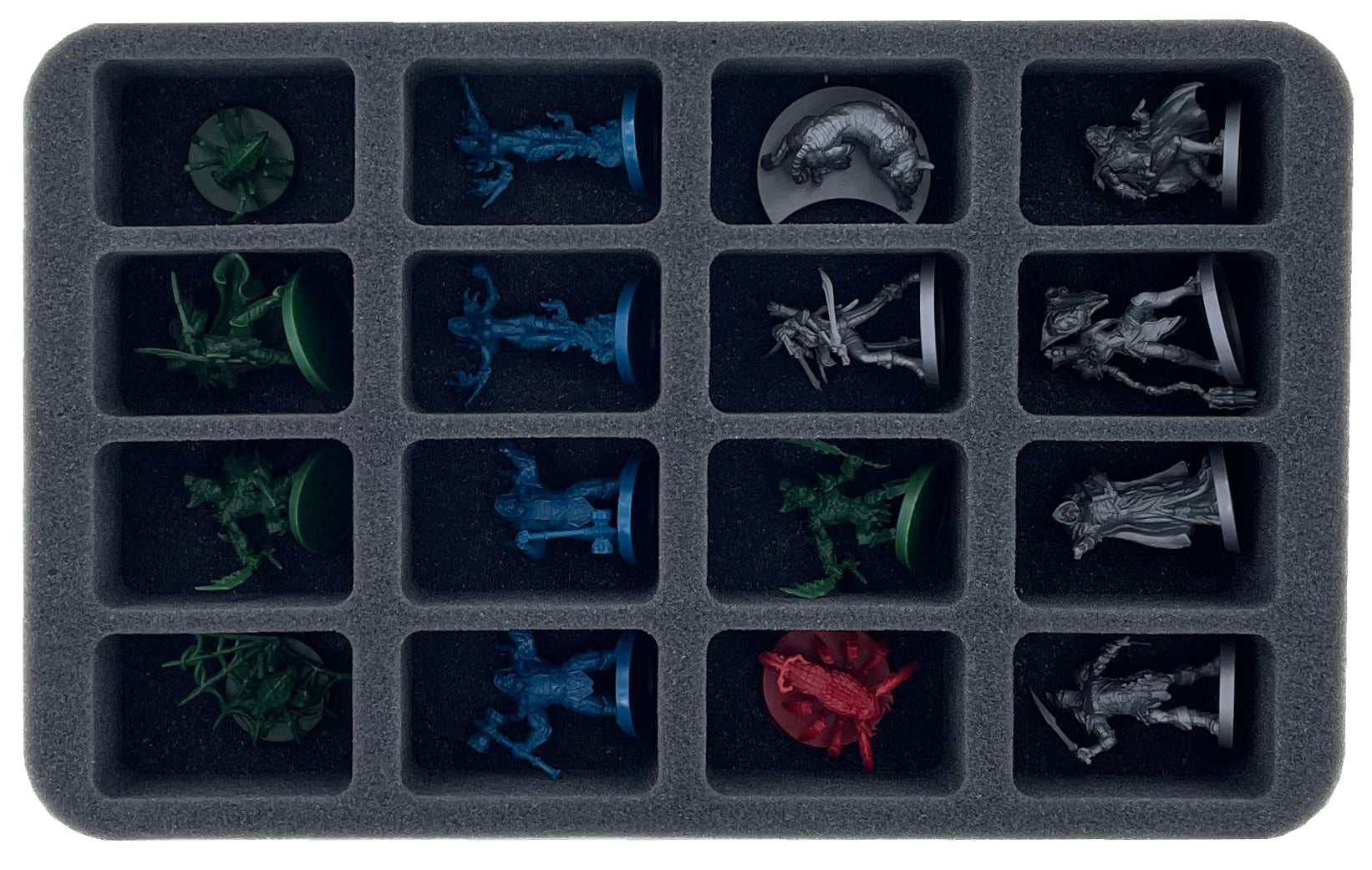 Whether hero or master enemy figure, each miniature receives a custom-fit compartment in the two foam inserts. Thanks to these, the miniatures have a tight fit. Even if it should be a little bumpier during transport, they do not slip and remain in place.