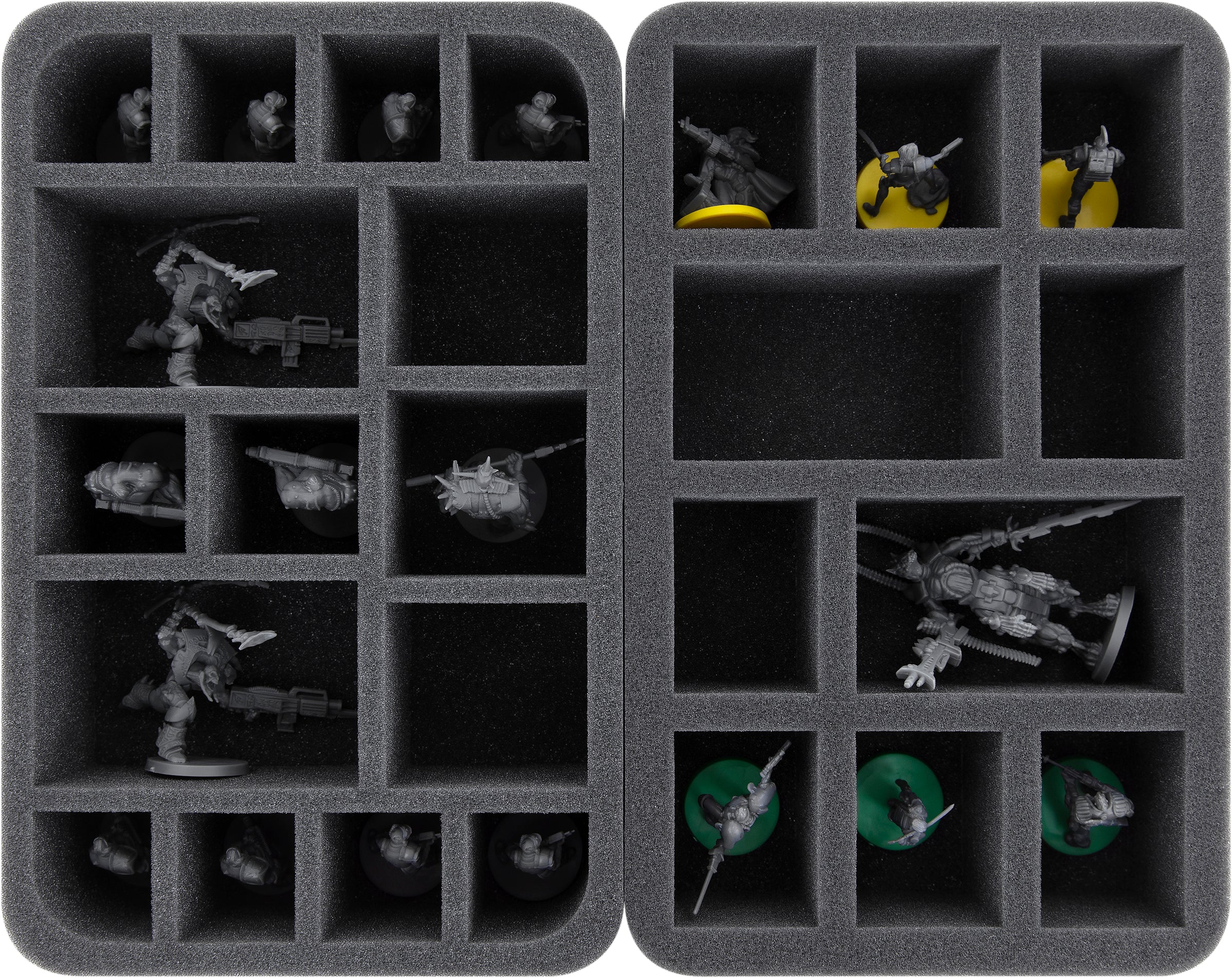 Your bag or board game box without foam is a hostile place for miniatures. Broken off parts, ugly scratches, and chipped paint threaten your painted miniatures. To protect your 45 miniatures, we've packed one Full-Size and two Half-Size foam trays into the bag. From the Dark Legion Legionnaires to the various Doomtroopers, to the giant Ezoghoul, each model gets a matching compartment. The custom-fit cut prevents the figures from slipping around and bumping into each other during transport. This protects filigree details and your painted models won't be affected by abrasion and scratches. Thus, you only have to fear the darkness of space.