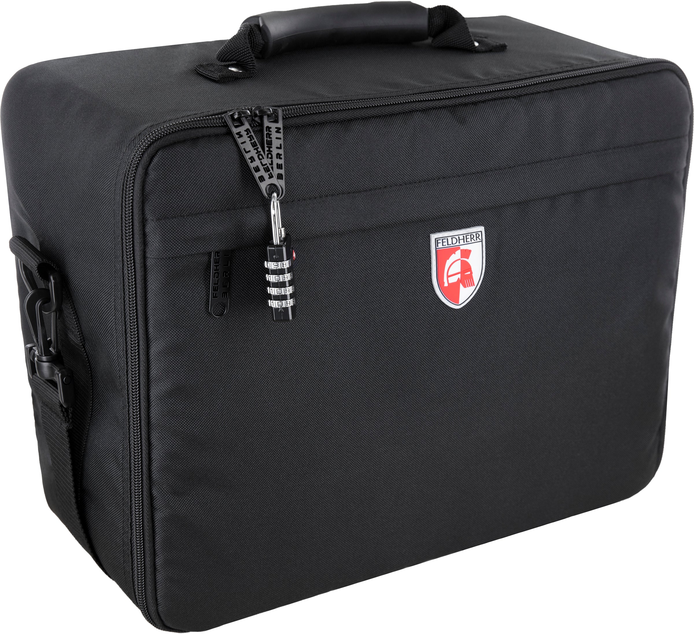 The black Feldherr MAXI PLUS bag is made of particularly hard-wearing fabric. Padded side panels and a reinforced base additionally ensure that the contents are optimally protected from external influences even when transported by car or train. It can also be locked and connected with an optional padlock. Next to the large main compartment, the bag has a smaller pocket with a zipper at the front. Game sheets, books and writing material can be stored here, for example.