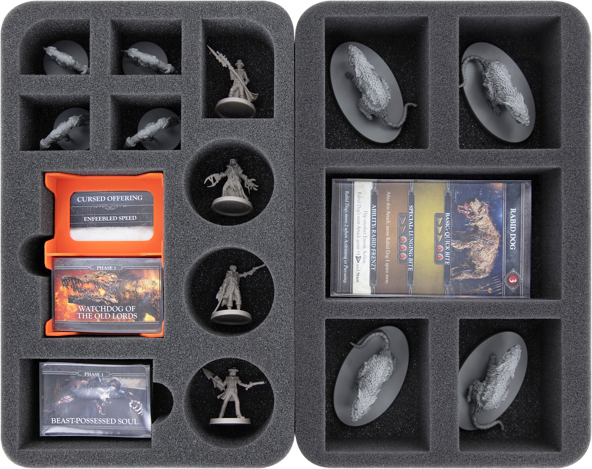 • 1 Half-size foam tray and 1 card holder for 8 miniatures + game cards (HSFW045BO + 59879)