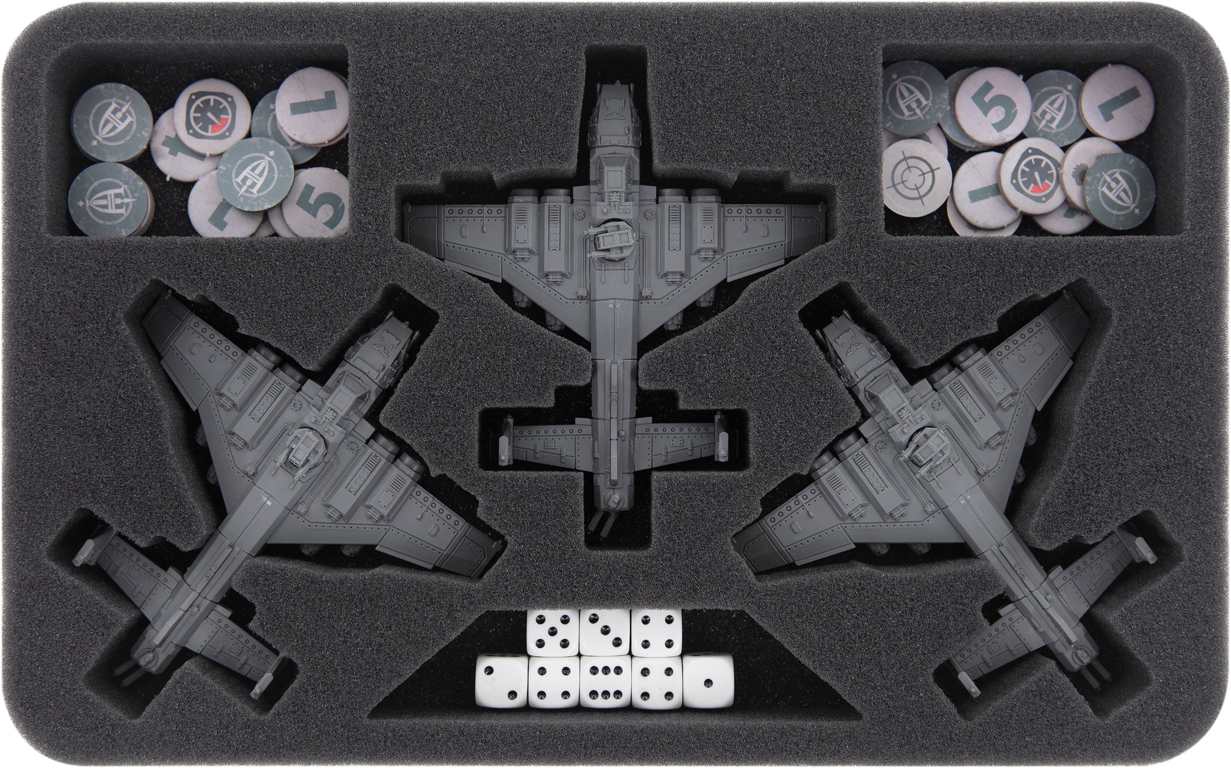 The Thunderbolt Fighter is the allrounder of the Imperial Navy. Up to six aircraft models of the Thunderbolt Fighter or the more offensive Fury Fighter variant can fit into the ten-compartment tray.