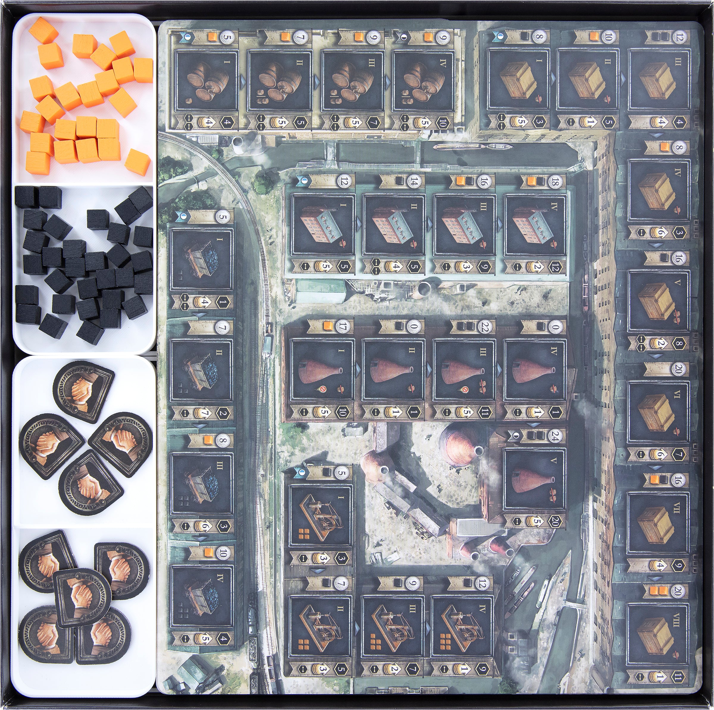 • You and each of your fellow players receive your own player trays. These come with individual inserts for the industry tiles. This way, you can effortlessly place the tiles directly on the game board.