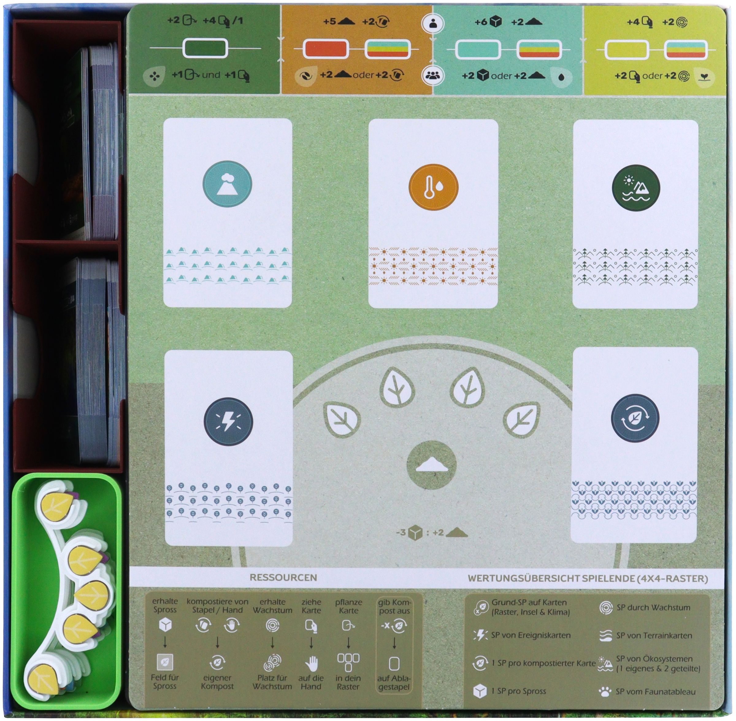 • One plastic card holder with two compartments (inner dimensions: 70 x 93 mm) for Fauna cards, Island cards, Climate cards, Solo game cards, and Ecosystem cards.