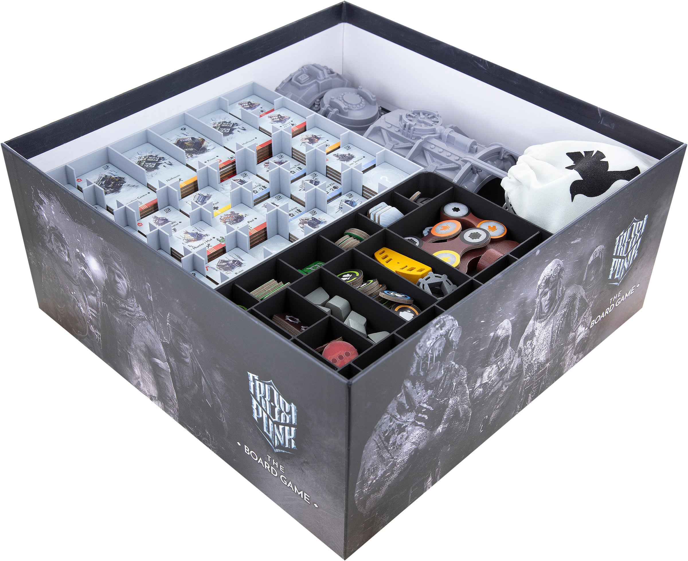 - It offers space for all components of the “Frostpunk: The Board Game” core game, as well as additional space for all components of the “Frostlander” and “Dreadnought” expansions.