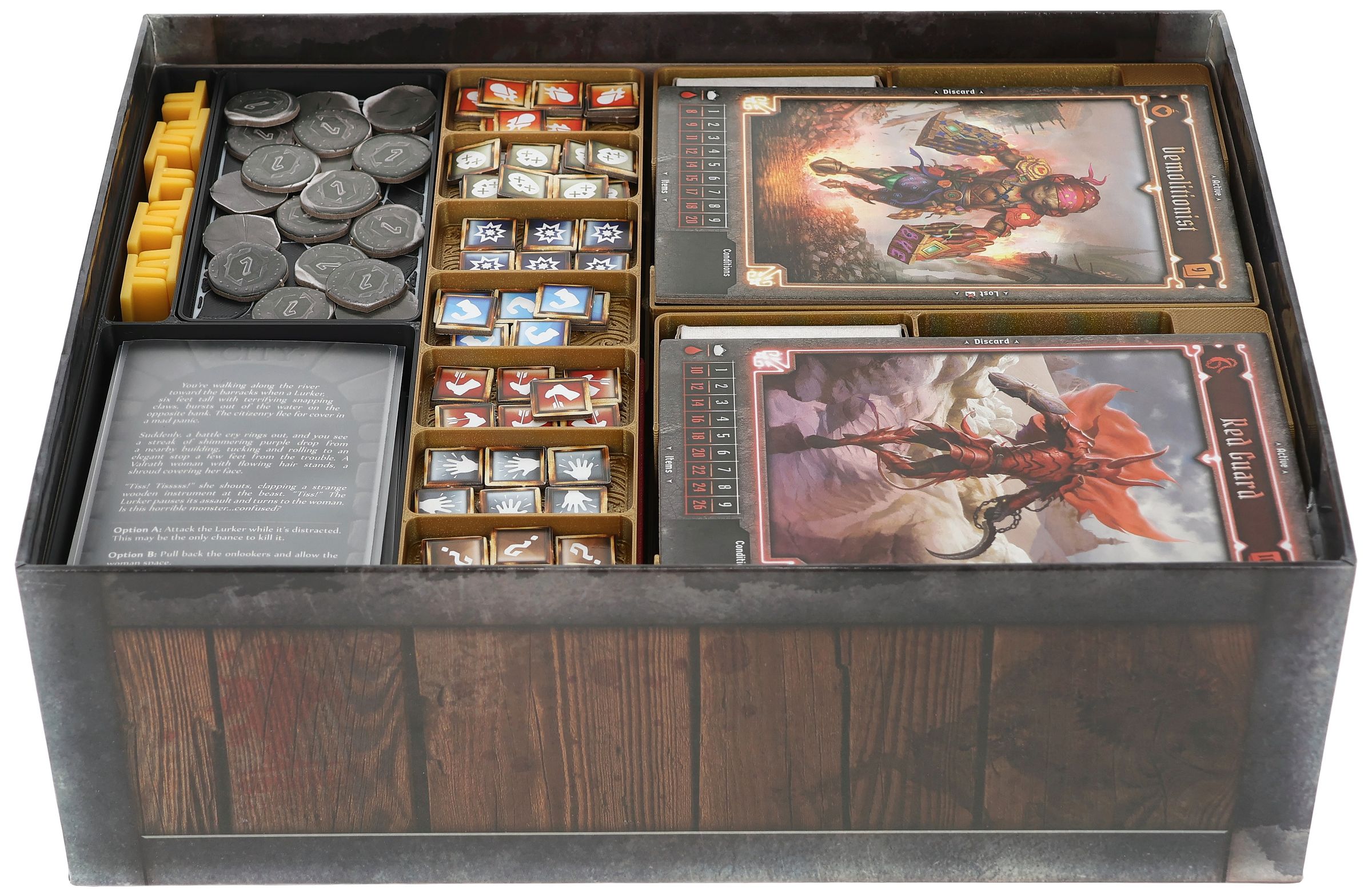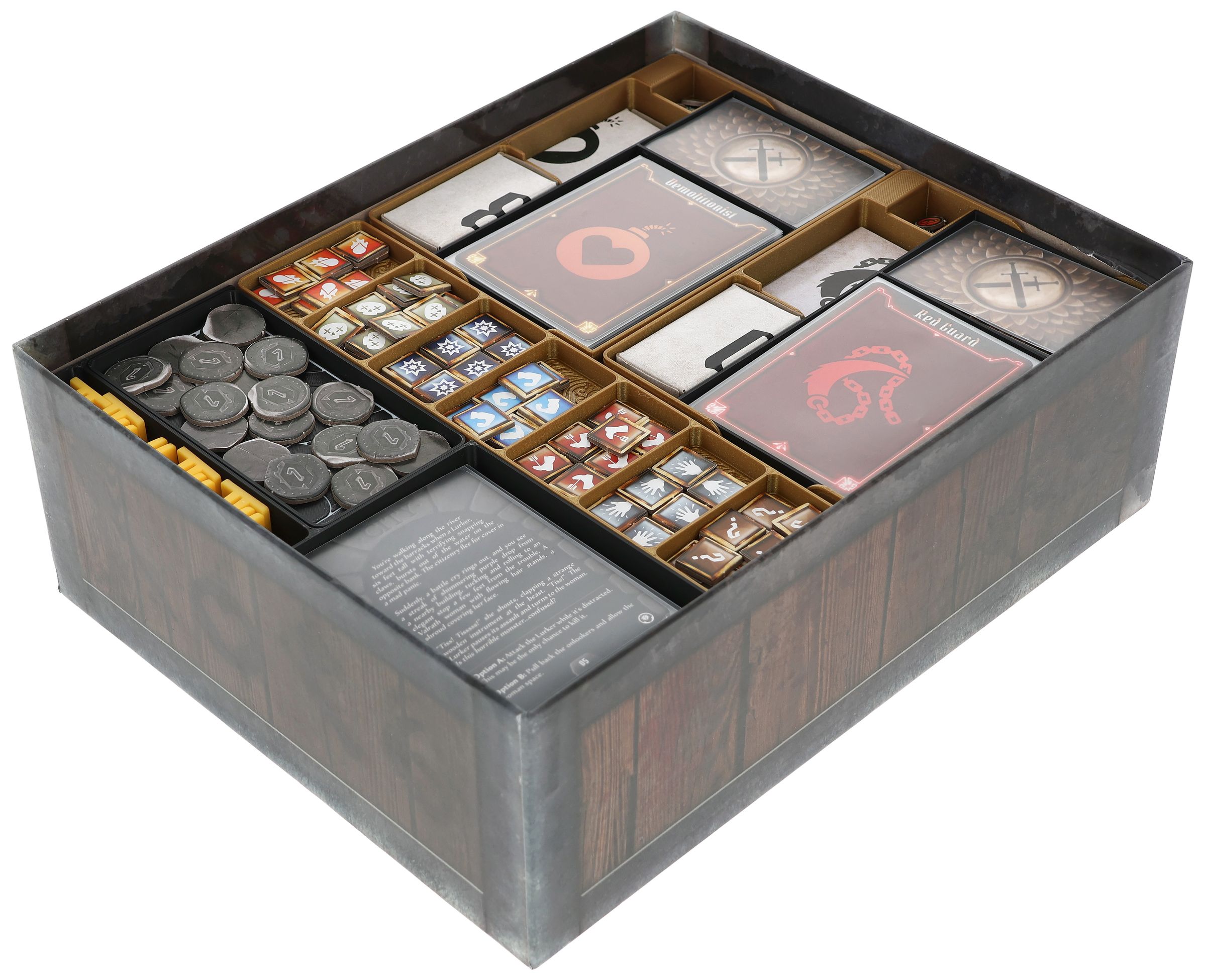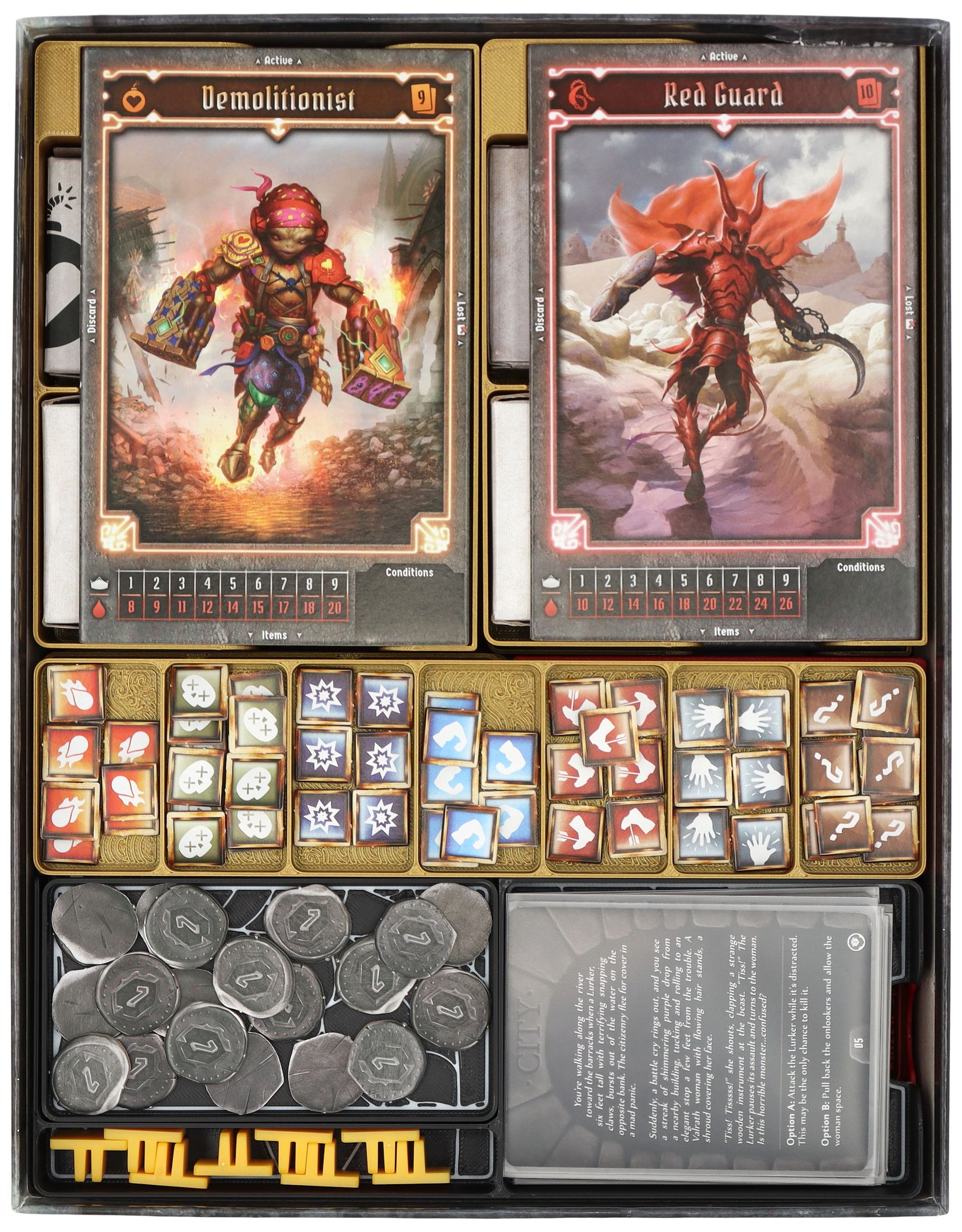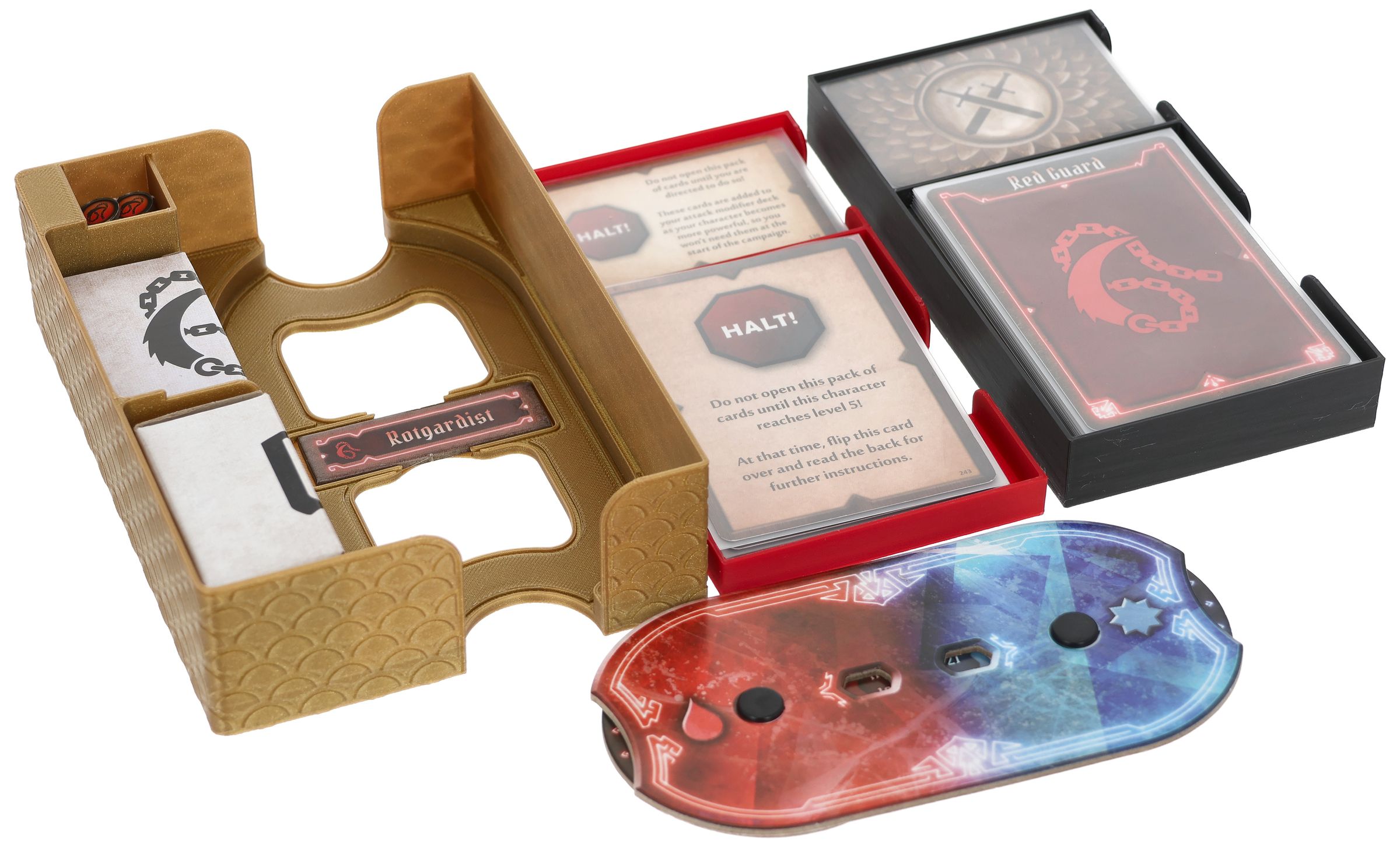 - A mini organizer for character-specific game material offers separate compartments for tuckboxes with miniatures, dial, token, character mat and cards. There is also space for unlockable cards from the campaign.