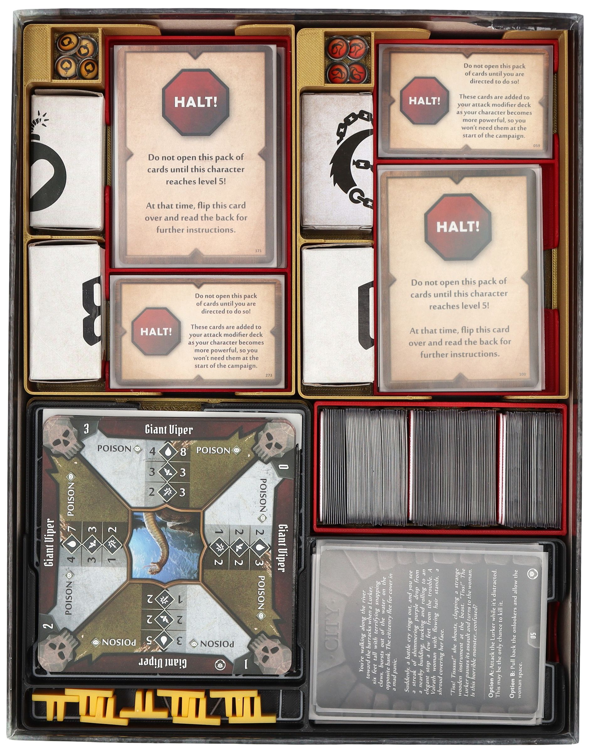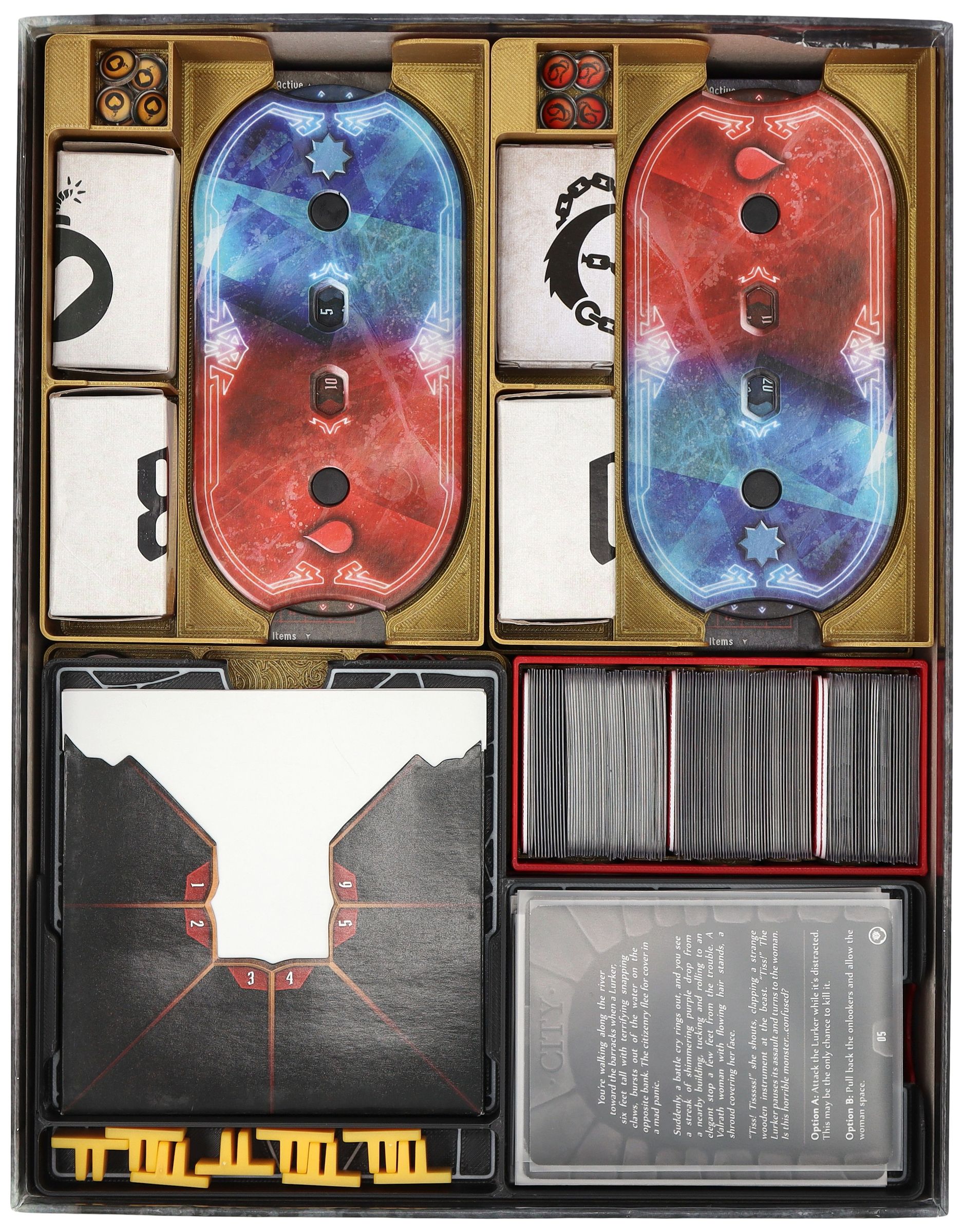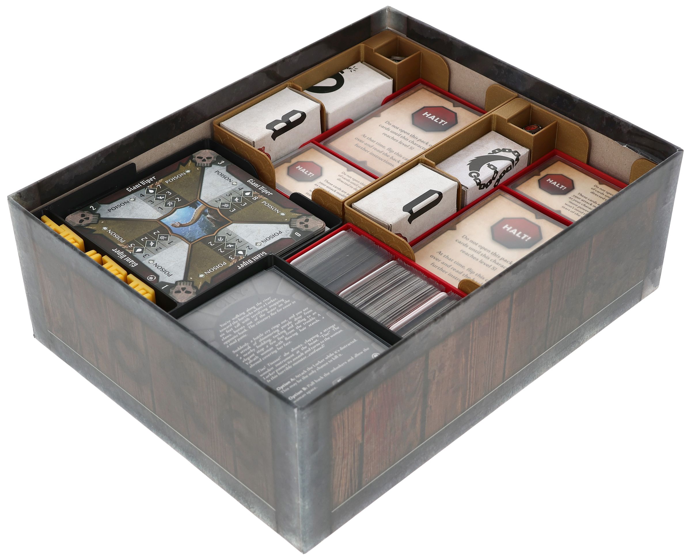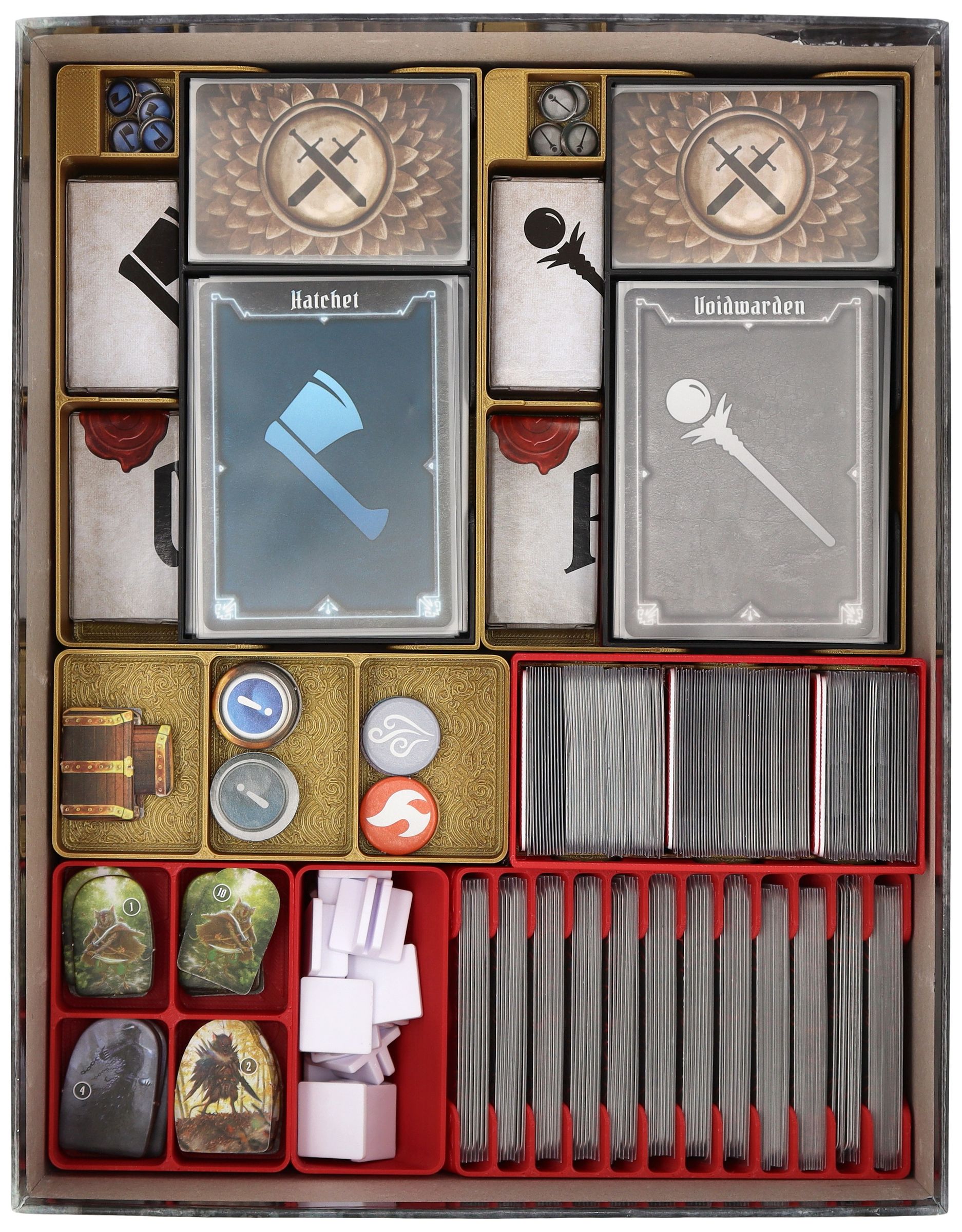 - A mini organizer for character-specific game material offers separate compartments for tuckboxes with miniatures, dial, token, character mat and cards. There is also space for unlockable cards from the campaign.