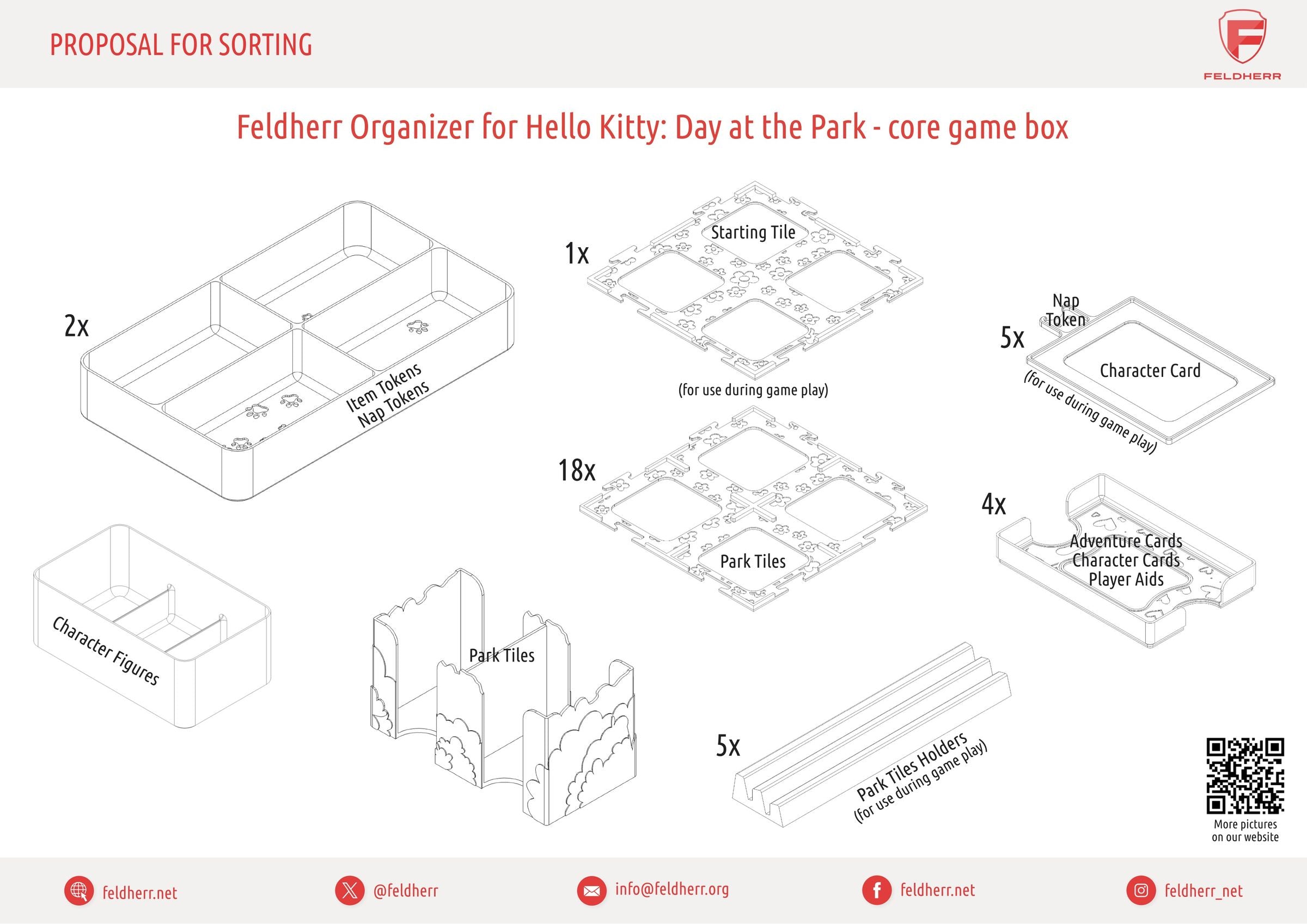 - The Organizer, made of sturdy plastic, fits perfectly into the Hello Kitty: Day at the Park board game box. External dimensions of the organizer: 257 x 257 x 58 mm.