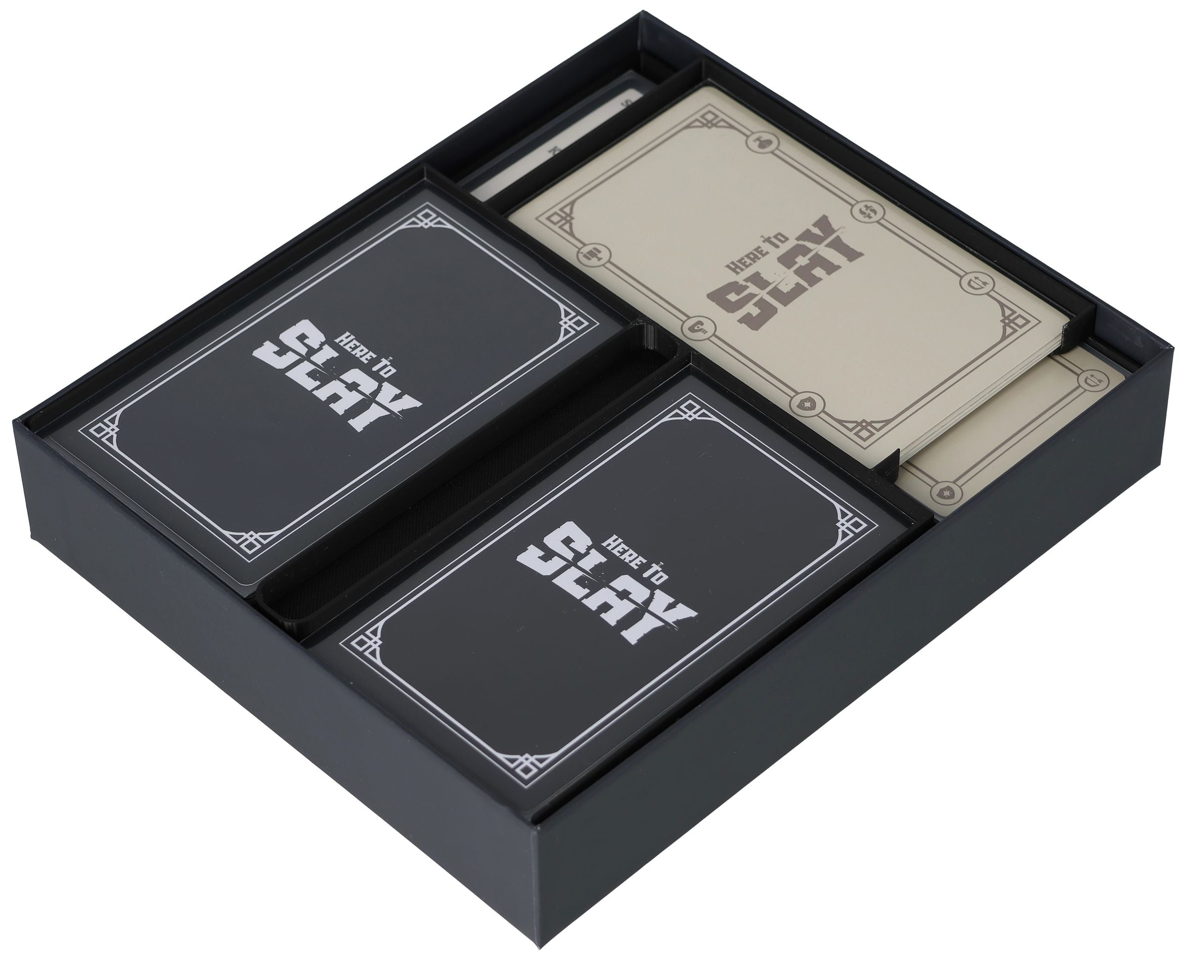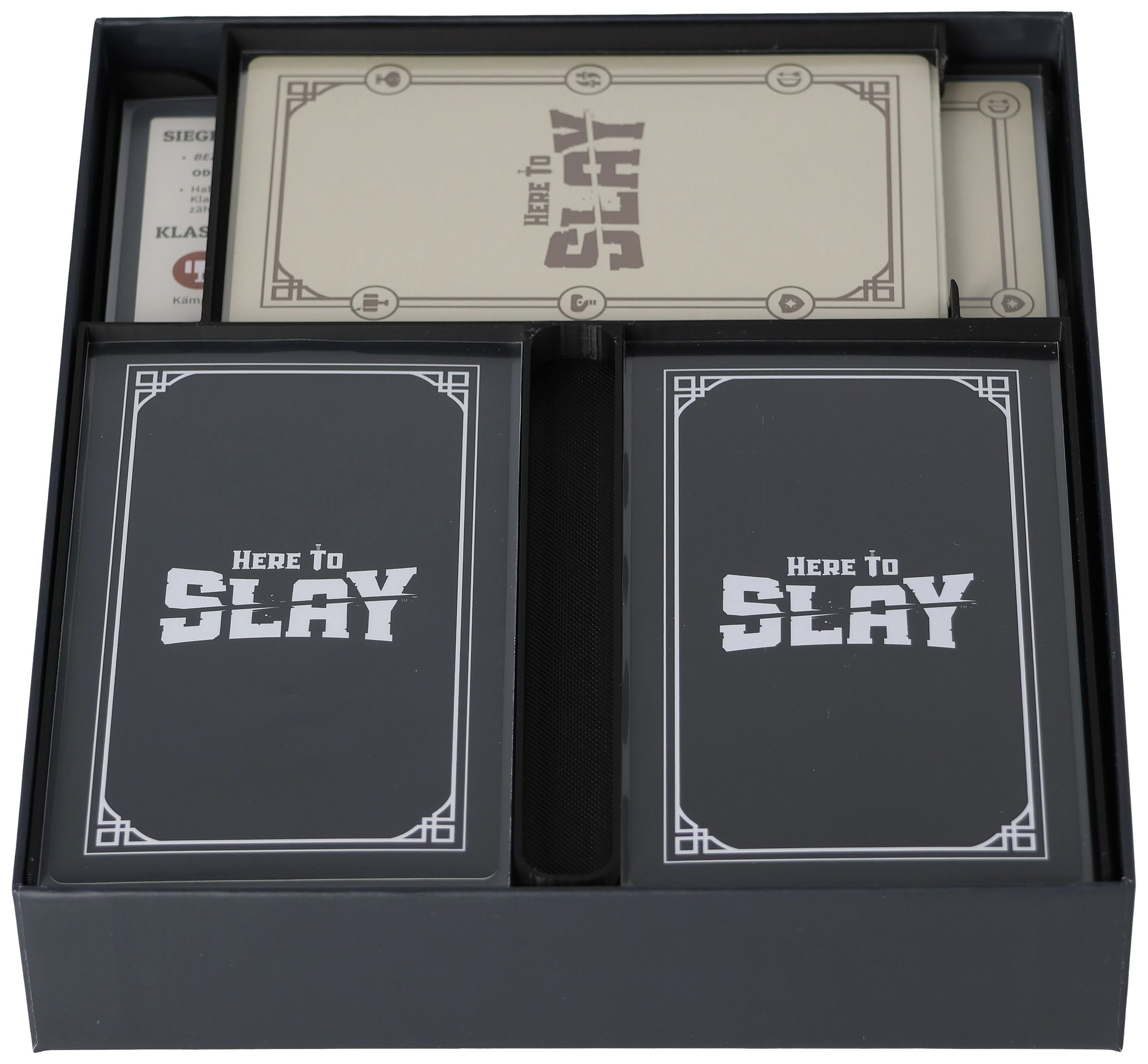 - The card holder set fits exactly into the original core game box of the German 2nd edition of "Here to Slay" (dimensions of the organizer: 199 mm x 167 mm x 38 mm).